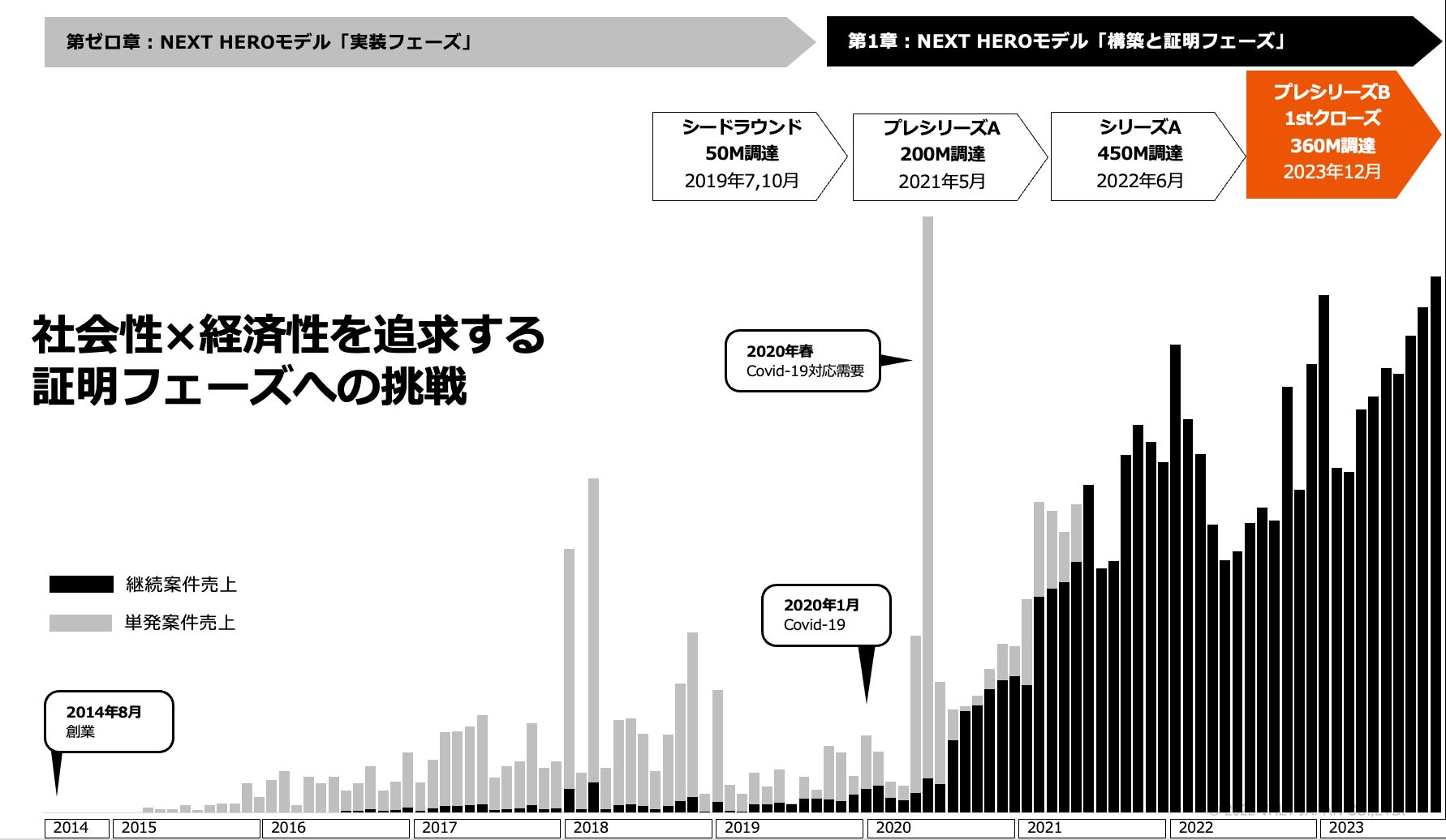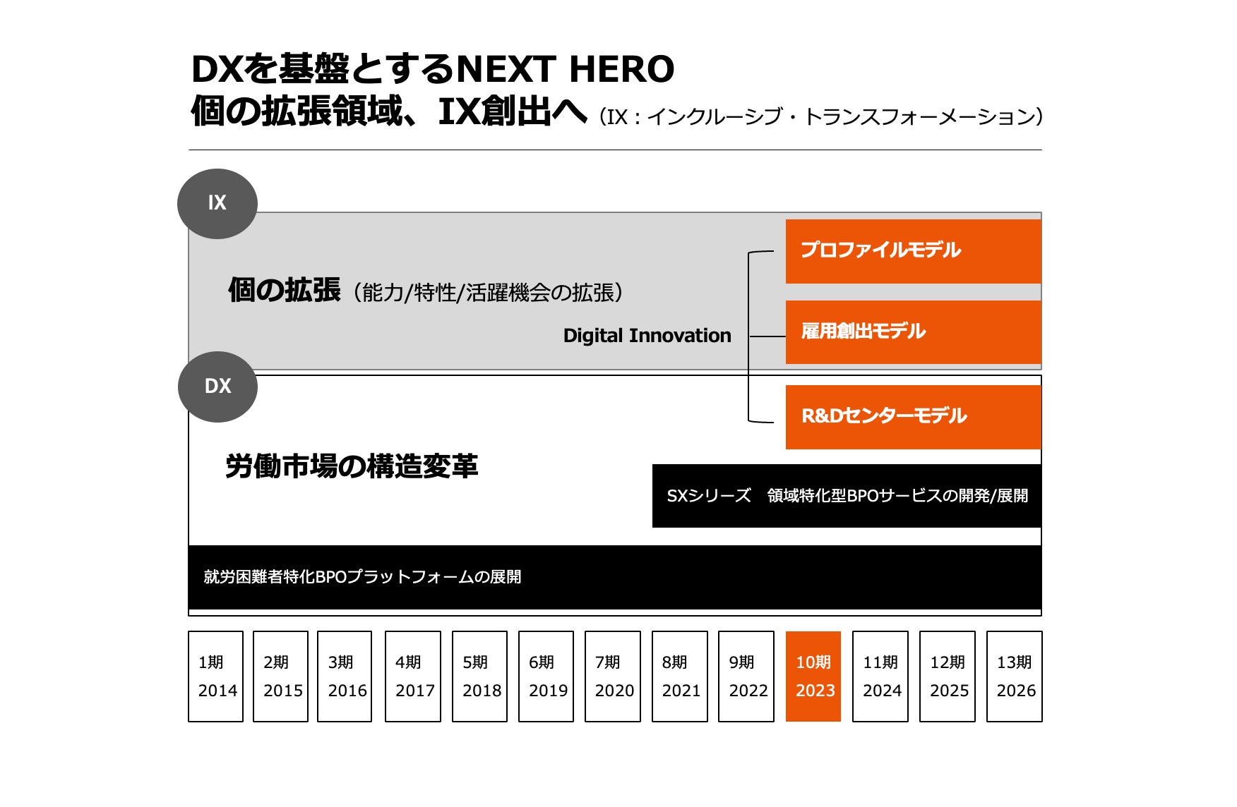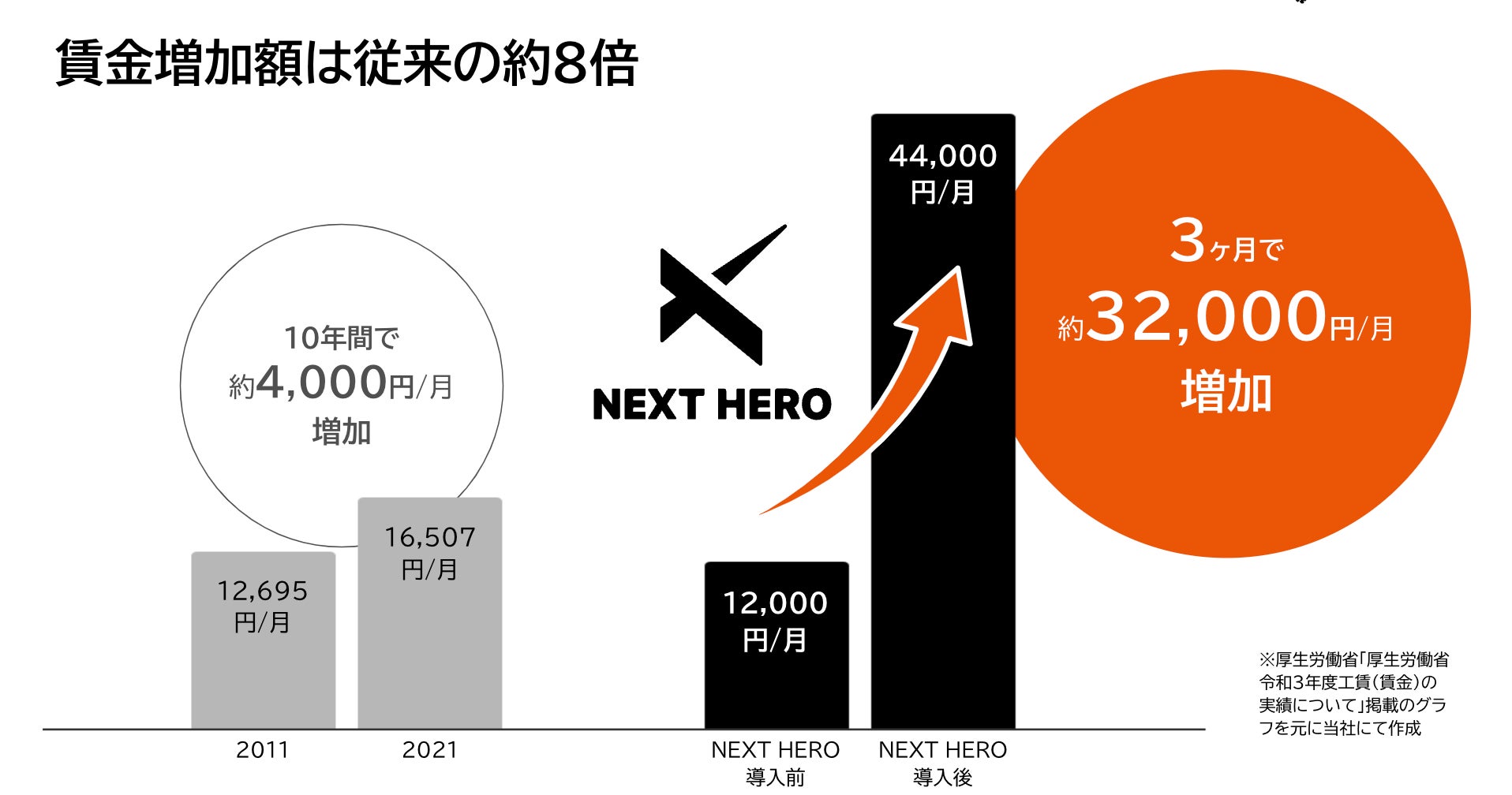 弊社は2023年に10期目に入り、取引社数累計370社、受注件数1,500件を突破、就労継続支援事業所のネットワークは累計2,000を超え、成長し続けております。ワーカーサイドでは、NEXT HEROを通じて平均⼯賃200%以上、従来の増加額の500%(3,000円/月→1.4万円/月)の増加を証明してきました。