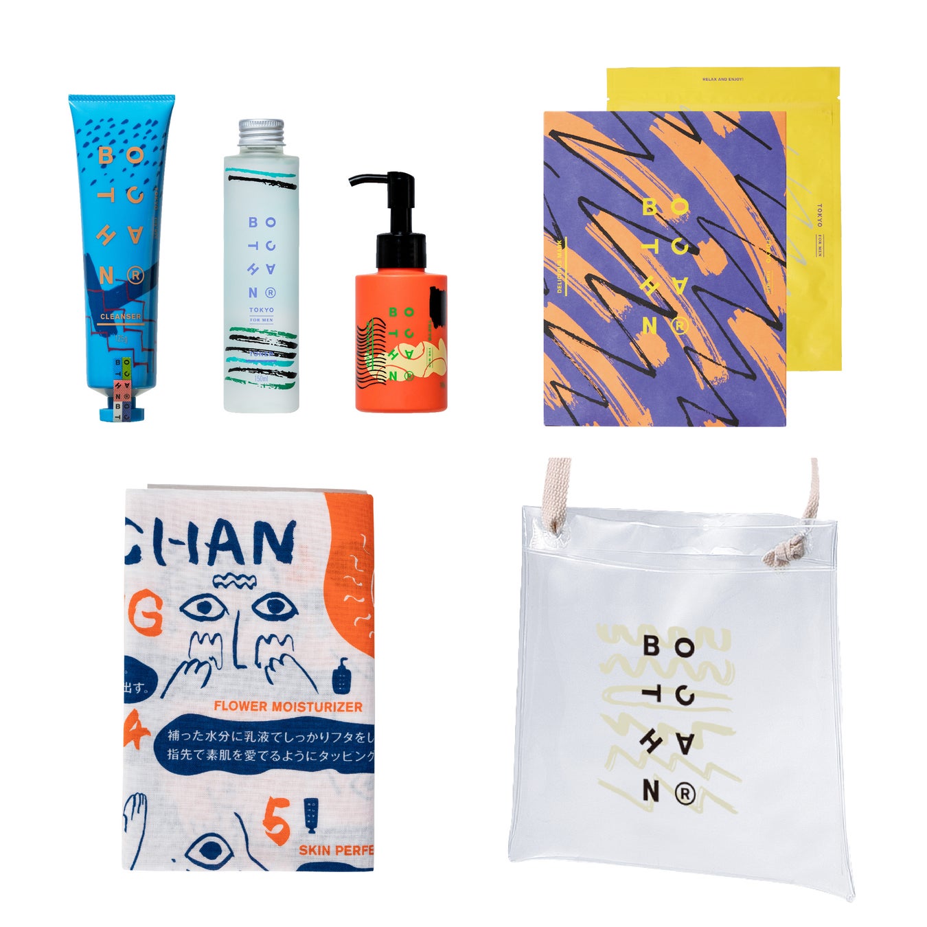 BOTCHANで人気のスキンケアアイテム4点に、BOTCHANならでは遊び心をプラスしたHow to BOTCHAN手ぬぐいと温泉やサウナに持っていきやすいウォータープルーフのオリジナルクリアサコッシュがセットに。