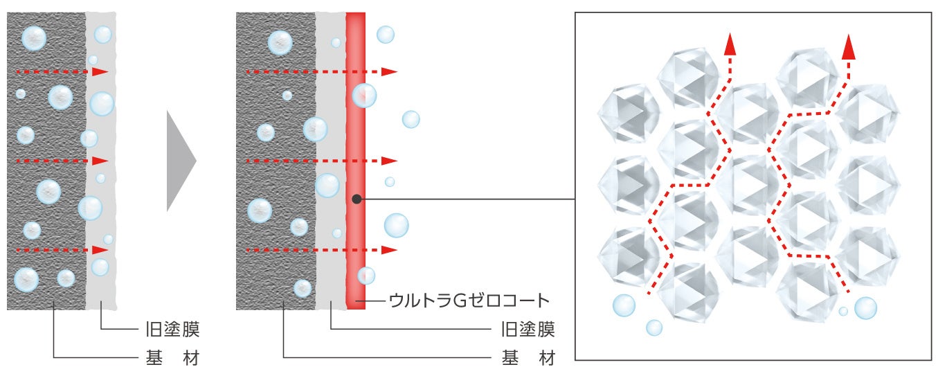 ウルトラGゼロコートは、石垣状に組まれた超親水シリカが基材内部の水分を呼びこみ、シリカ粒子を伝って外部へ放出し続けるため、塗膜は常に乾燥した状態を保ち膨れや剥離のリスクを低減します。