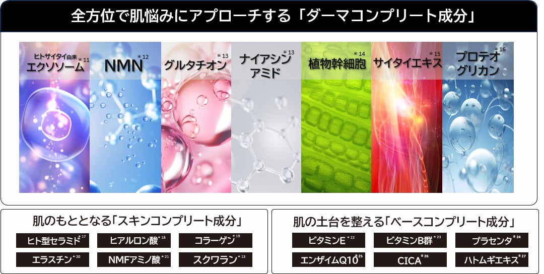 *1当社内における独自原 *2気になる部分へ集中的に使用 *3超高圧加工処理装置を用いた原料 *4角質層まで *5肌にうるおいを与え、乾燥により目立った毛穴を目立たなくすること *6乾燥してキメが乱れた肌 *7超高圧処理したテトラヘキシルデカン酸アスコルビル(保湿成分)*8効能評価試験済み *9超高圧処理した水添レチノール(保湿成分)*10うるおいえを与えることで艶やかに見える印象 *11ヒトサイタイ血由来幹細胞エクソソーム(保湿成分)*12ニコチンアミドモノヌクレオチド(保湿成分)*13保湿成分 *14サポナリアプミラカルス培養エキス(保湿成分)*15ヒト臍帯血順化培養液(保湿成分)*16水溶性プロテオグリカン(保湿成分)*17セラミドNP・セラミドAP・セラミドNG、セラミドEOP(保湿成分)*18ヒアルロン酸ヒドロキシプロピルトリモニウム、ヒアルロン酸Na(保湿成分)*19加水分解コラーゲン(保湿成分)*20加水分解エラスチン(保湿成分)*21グルタミン酸、ロイシン、アルギニン、セリン、トレオニン、アスパラギン酸、プロリン、グリシン、バリン、アラニン、フェニルアラニン、イソロイシン、チロシン、リシン、ヒスチジン(保湿成分)*22トコフェロール(保湿成分)*23チアミンHCl、パンテノール、ピリドキシンHCl、シアノコバラミン、葉酸(保湿成分)*24プラセンタエキス(保湿成分)*25ユビキノン(保湿成分)*26ツボクサエキス(保湿成分)*27ハトムギ種子エキス(保湿成分)