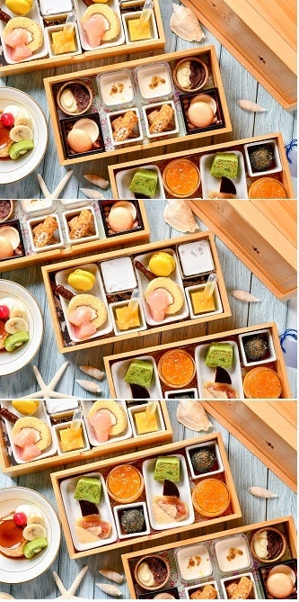 檜の岡持ちに詰め込まれた多彩な和洋スイーツとセイボリー