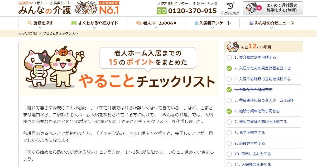「みんなの介護」フリーダイヤル入居相談センター(年中無休 9:00~19:00):0120-370-915
