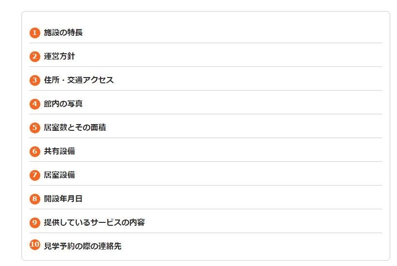 老人ホームへの入居後に後悔しないために、費用、入居条件、立地、居室、介護・医療連携、食事などのについての詳しいチェックポイントを一覧化しています。老人ホームを事前に見学する際の「うっかりした聞き漏れ」を防ぐことができます。
