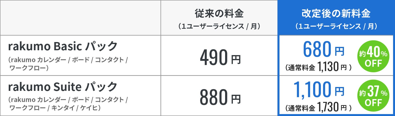 今回発表した 「rakumo for Google Workspace」 の大幅アップデートや、生成 AI を活用した機能強化、有償オプションの標準化などに伴い、一部製品およびパックで料金体系を改定いたします。