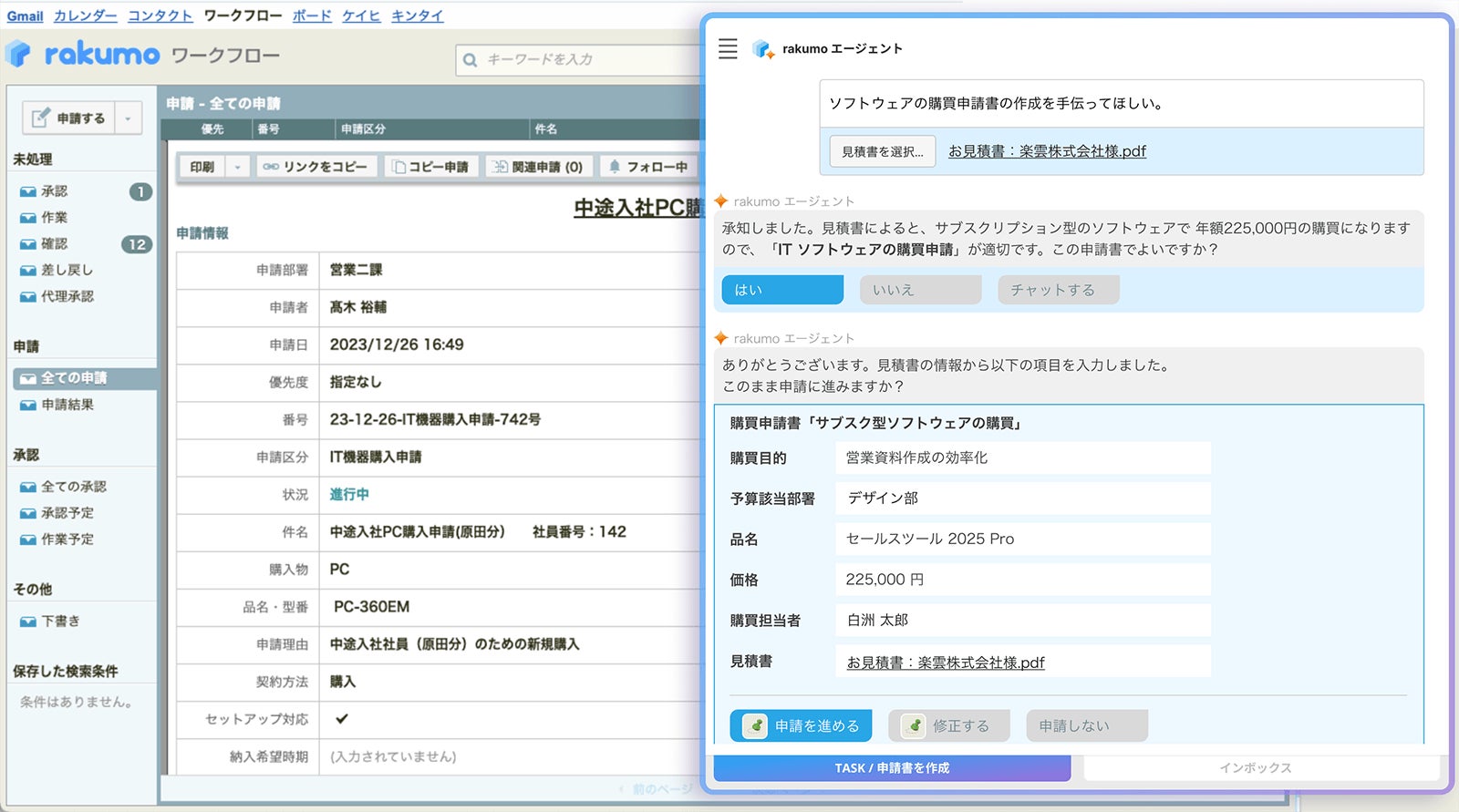 rakumo エージェントに見積書などのファイルを提示すると、内容を自動で分析します。その後、適切な申請書を提示するとともに、見積書に記載された情報の自動入力も行い、申請プロセスをさらに効率化します。