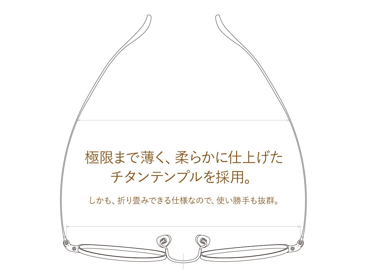 さらに、テンプル(耳にかける)部分は極限まで薄く、柔らかく仕上げています。エアリーなかけ心地で、お家でごろごろしている時に最適です。