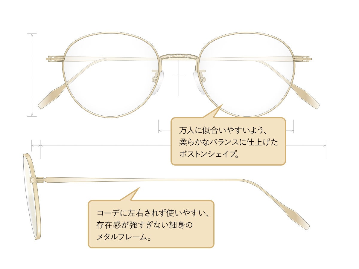 コーデに左右されず使いやすい、存在感が強すぎない華奢なメタルフレーム。また、女性らしい柔らかなボストンシェイプを追求しました。トレンドやシーズン、お洋服に左右されず、オンでもオフでも気にせずお使いいただけるフレームに仕上がっています。