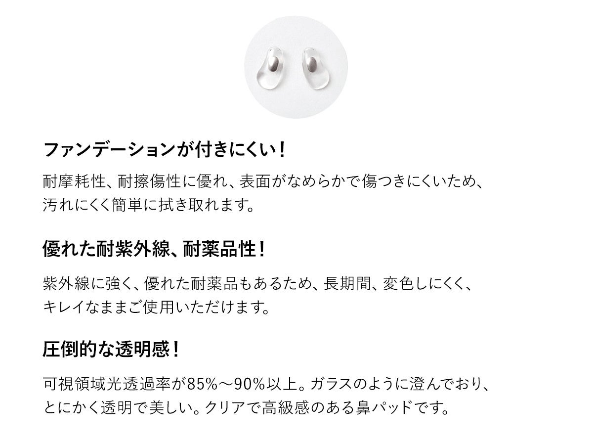 メガネ女性の悩みで多いのが、ファンデーションに残るメガネの跡。今回は、ファンデーションが付きにくく、跡が残りにくい特製の鼻パッドを採用しました。