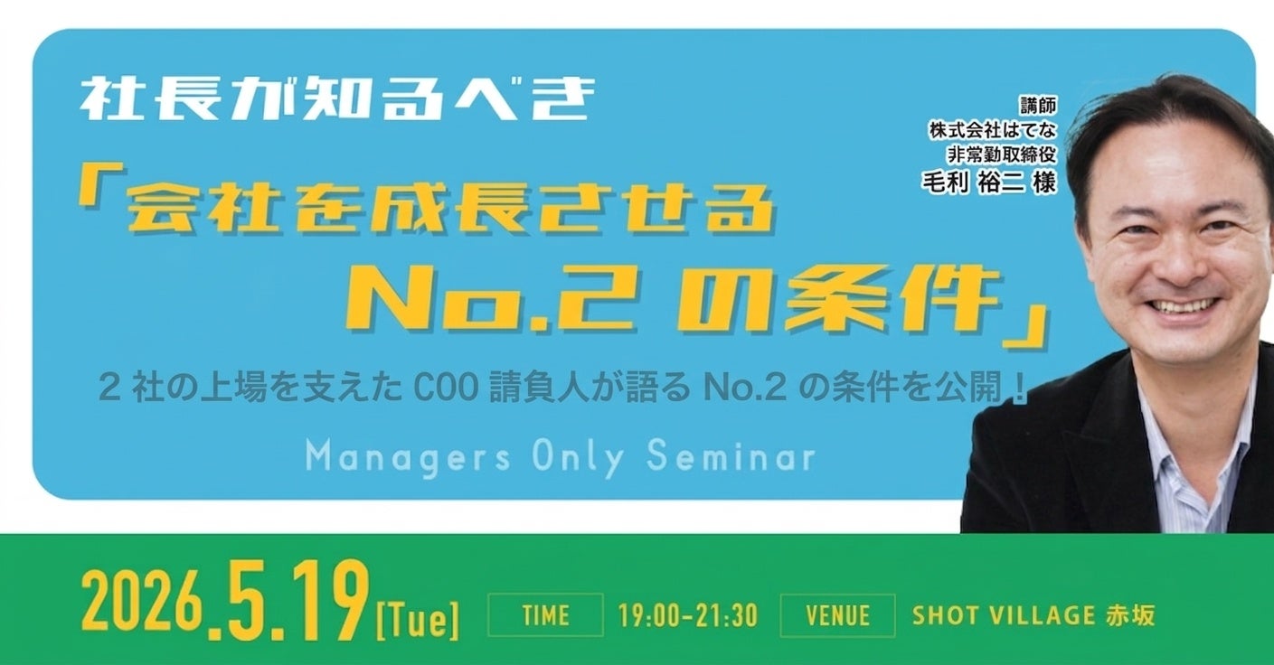 経営者コミュニティ「参謀」を運営する株式会社経営参謀(本社:東京都新宿区、代表取締役:新谷 健司)は、2026年5月19日(火)に勉強会「社長にこそ知ってほしい『会社を成長させるNo.2の条件』とは?」を赤坂会場(SHOT VILLAGE 赤坂店)にて開催します。本勉強会では、株式会社はてな・株式会社アイレップの2社の上場を支えた"COO請負人"こと毛利裕二氏をゲストに迎え、会社を成長させる「No.2」の条件、見つけ方、採用方法、付き合い方について、実体験に基づいた知見をお伝えします。