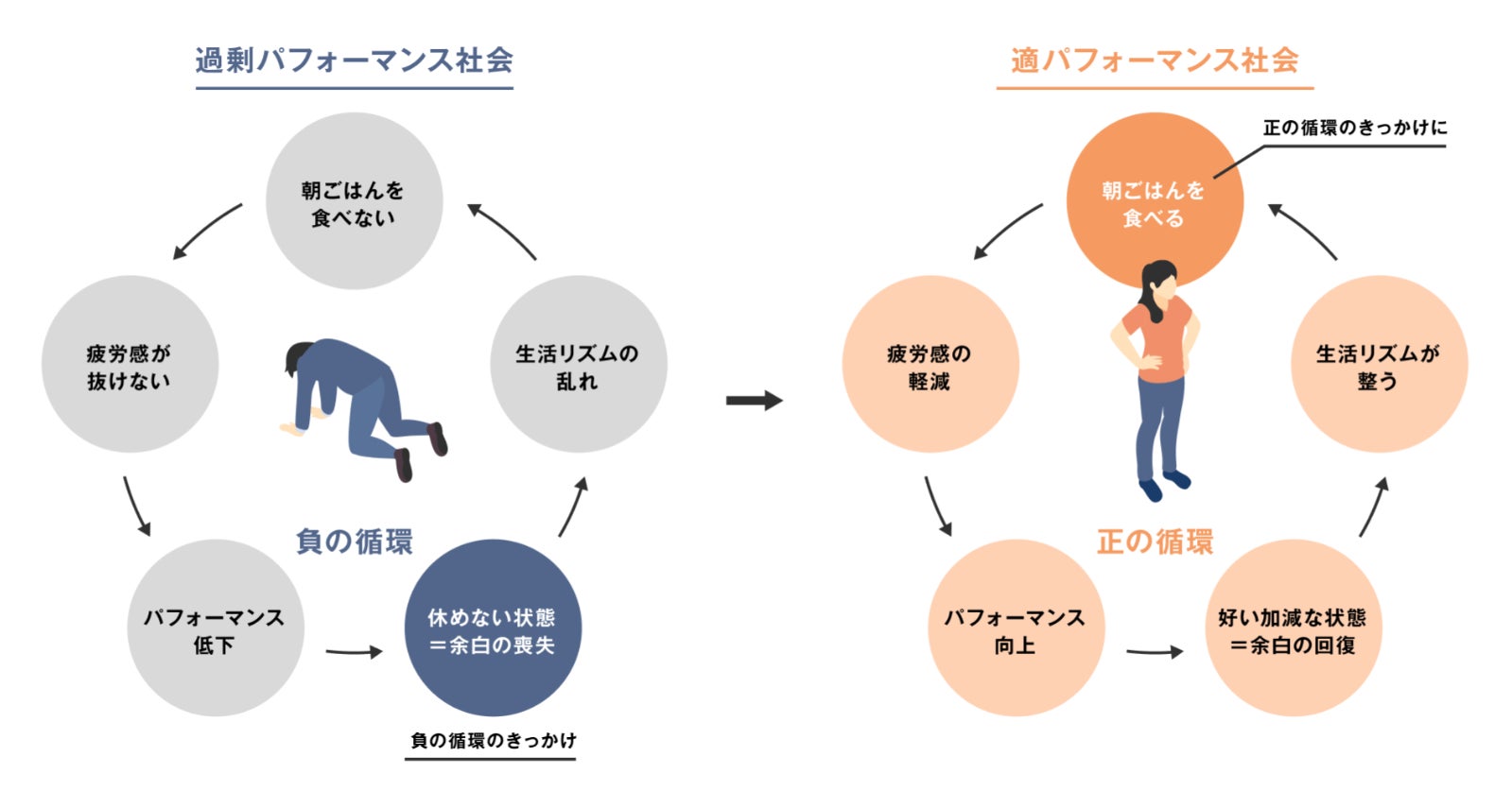 忙しさに追われ、生活リズムが乱れ、疲れがたまっていく――。そんな負の循環を断ち切るきっかけとして、「朝」に注目。心と体にエネルギーをチャージする朝ごはんを食べることで、疲労感が軽減、パフォーマンスが向上し、生活リズムが整う――といった正の循環を生み出していくことを目指します。