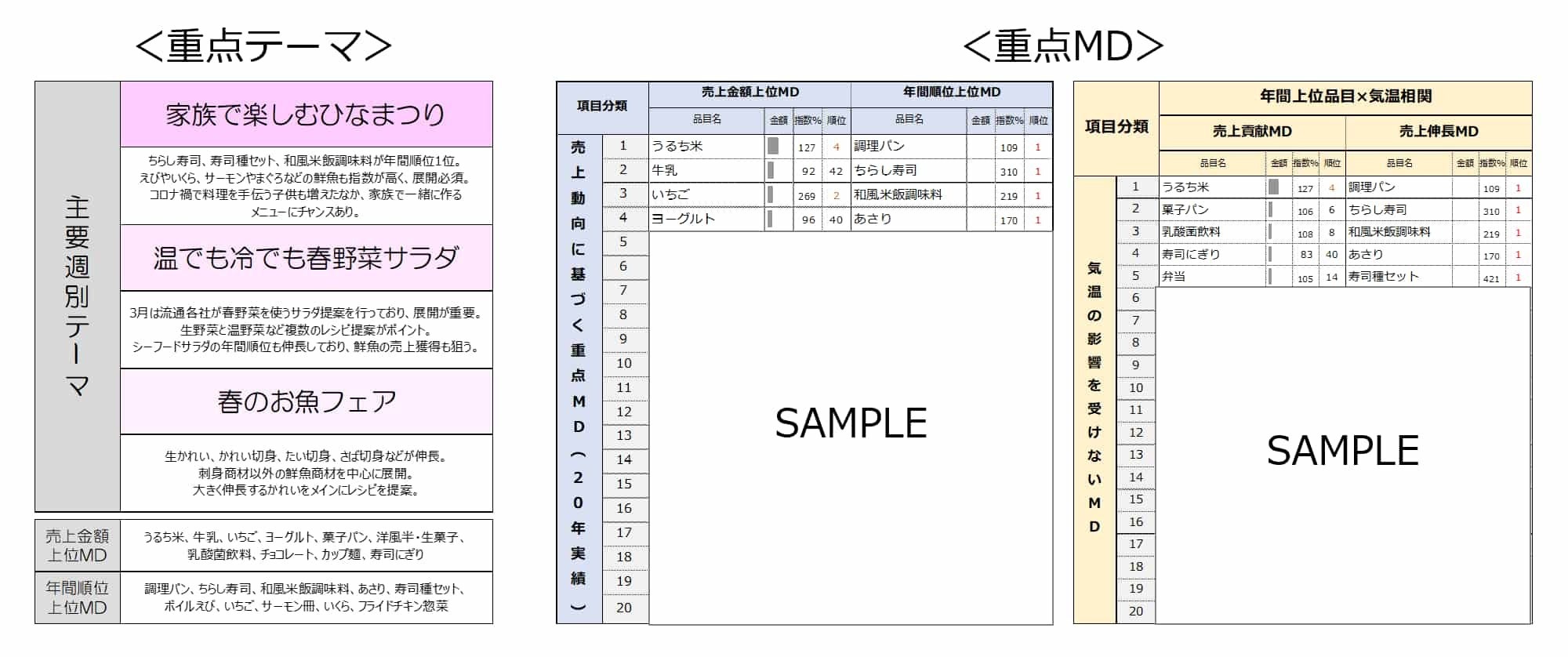 各週の歳時・生活行動、気象傾向、社会行事といった環境与件とPOSデータを分析し、52週毎に重点的に取り組むべきテーマ・MDを掲載しています。客観的データに基づいた重点テーマ・MDにより、月や週・日々の販売効率をより高めることができます。