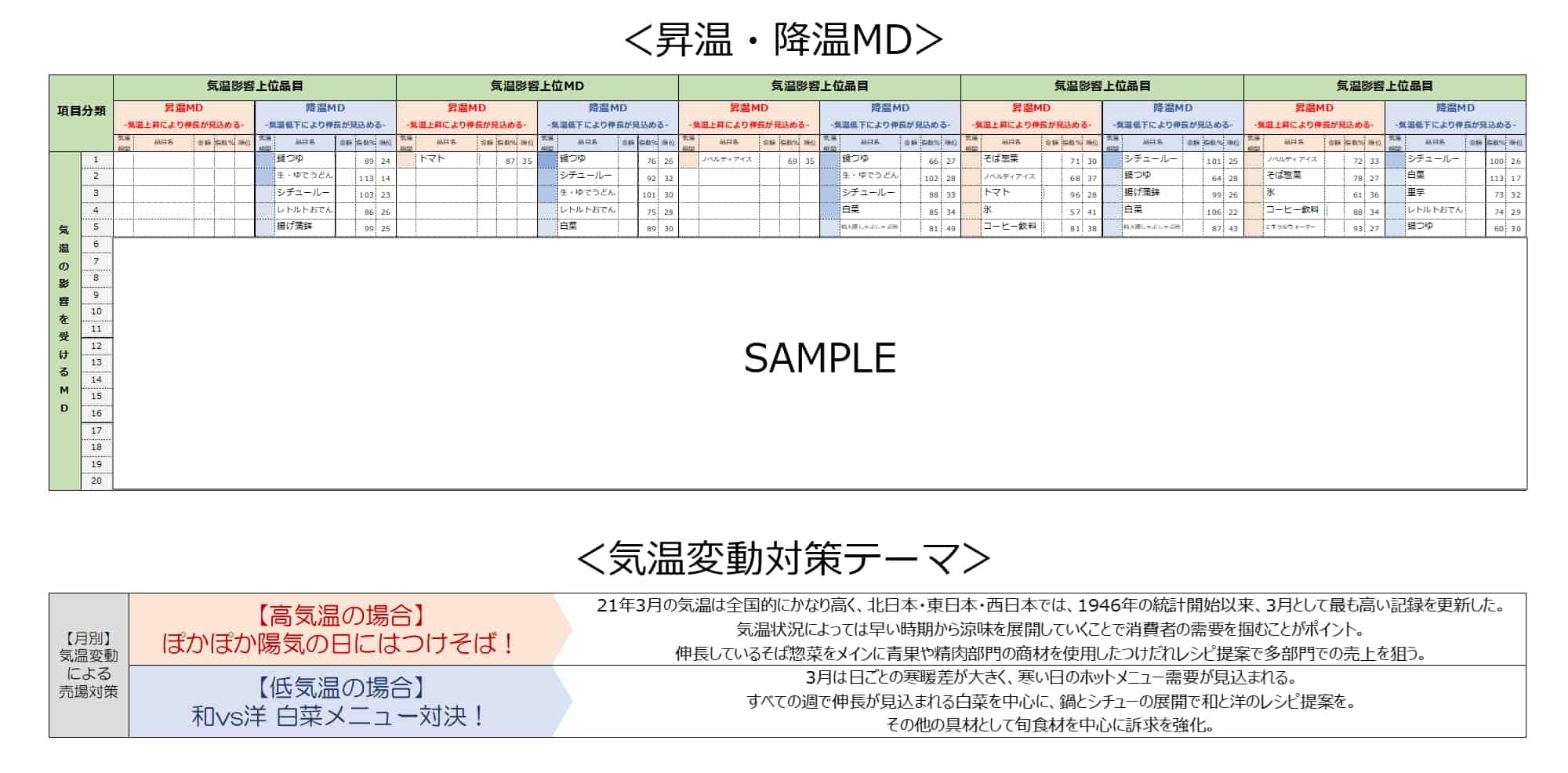 日本気象協会による気象データとPOSデータの解析結果を用いて、気温影響を受けて売上の増加が見込めるMD“昇温・降温MD”を掲載しています。また、昇温・降温MDを基に、気温変動に対応した月別販促テーマも提案しており、例年より暑い・寒いといった気象変動に伴う需要変化を捉えた対策テーマ案を把握できます。