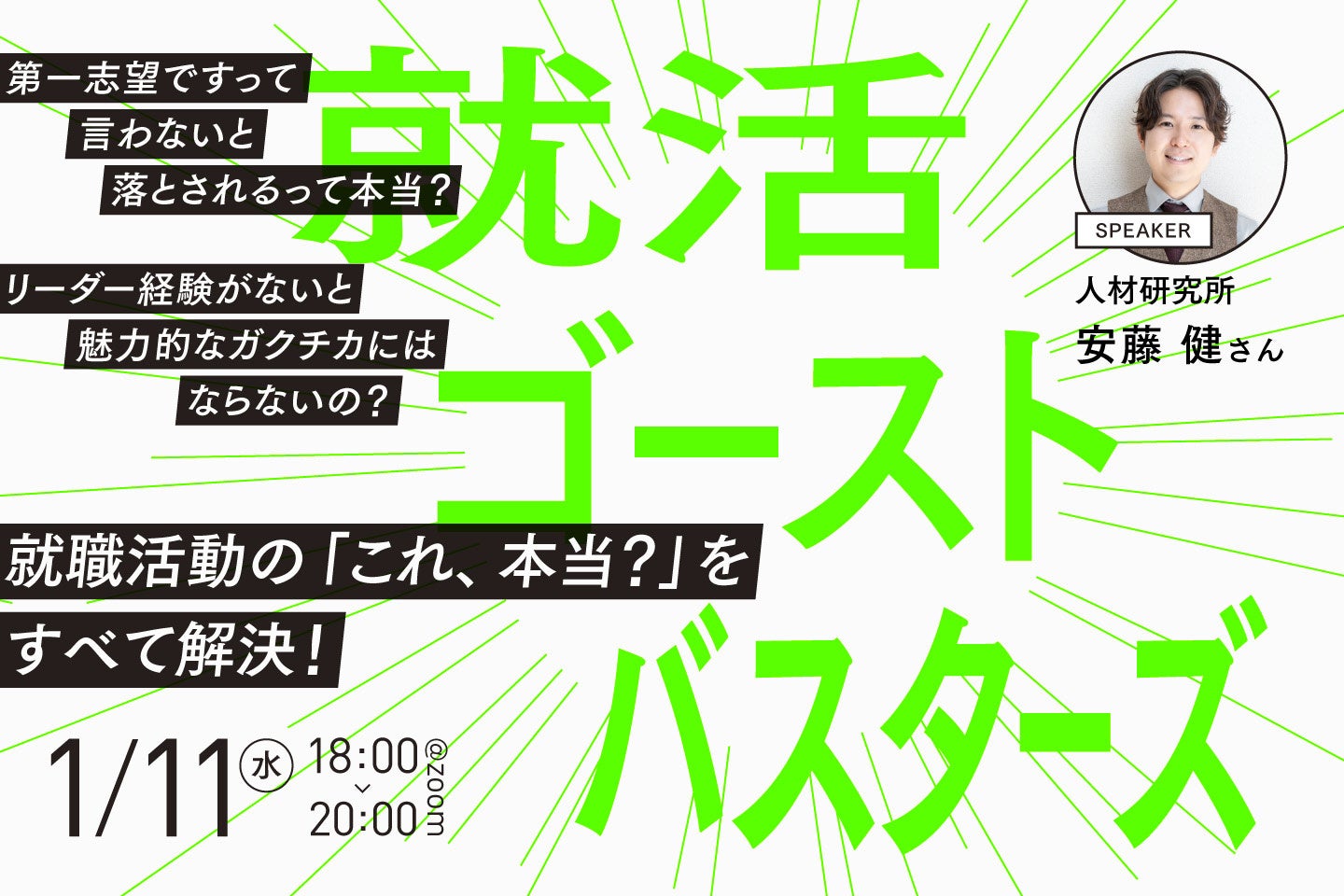 「選考では必ず第一志望だと伝えなければ落とされるのか」「ガクチカ(学生時代に力を入れたこと)にはリーダー経験が必須なのか」など、就職活動において一度は聴こえてくる疑問やうわさたち。本イベントでは、数多くの組織の人事コンサルティングや採用時に使用する「適性検査」の開発などにも携わる株式会社人材研究所の安藤健氏をスピーカーにお迎えして、実際に学生たちから投稿された相談なども取り上げながら、数々の都市伝説の真偽を確かめていきます。この場での対話をきっかけに、一人でも多くの就活生のみなさんが、お悩みを抱え込まず、前向きに今後の就職活動に取り組めることを願っております。