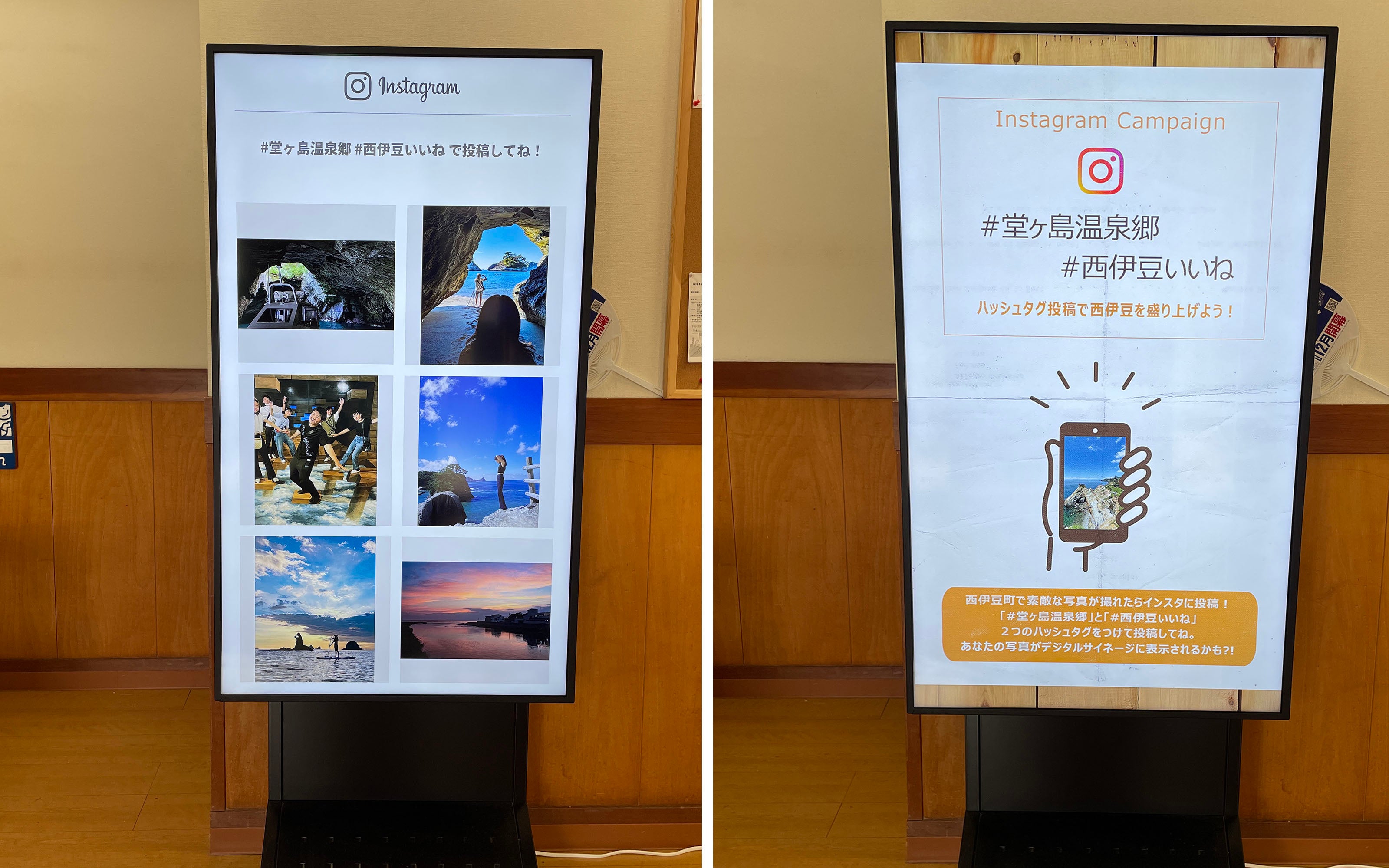 今回西伊豆町では、このPOSUMERUを導入し、インスタグラムのハッシュタグ「#堂ヶ島温泉郷」と「#西伊豆いいね」をつけて投稿していただいた情報を取得して、事務局で内容をチェックしたのち、デジタルサイネージに表示する取り組みを開始しました。