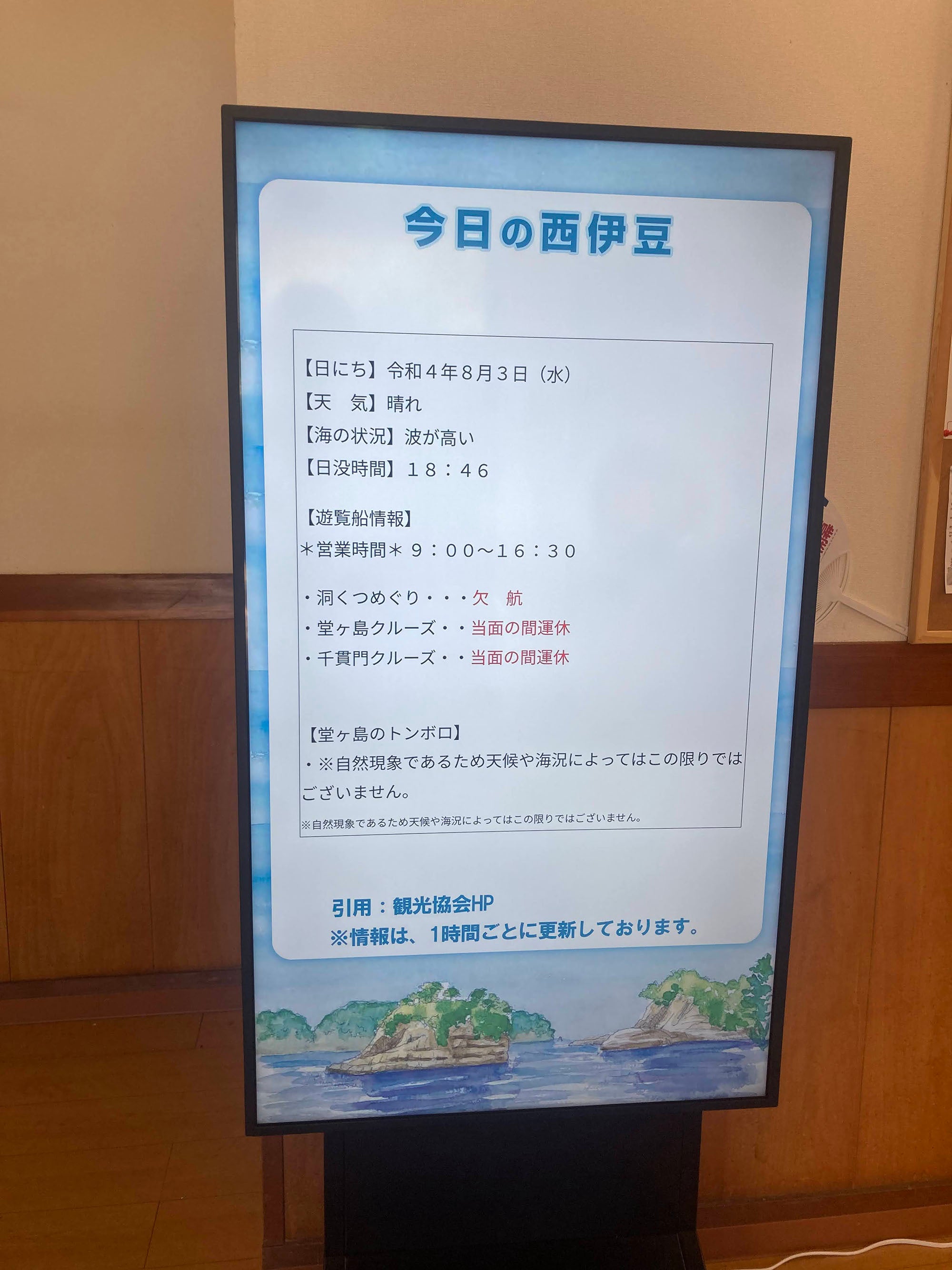 観光客にとっても、気になる今日の遊覧船運行情報や、天候・日没時間、潮位や堂ヶ島のトンボロが現れる予想などの情報が各エリアのデジタルサイネージですぐに確認することが出来、町内に訪れた方の利便性を高めるサービスとなっています。