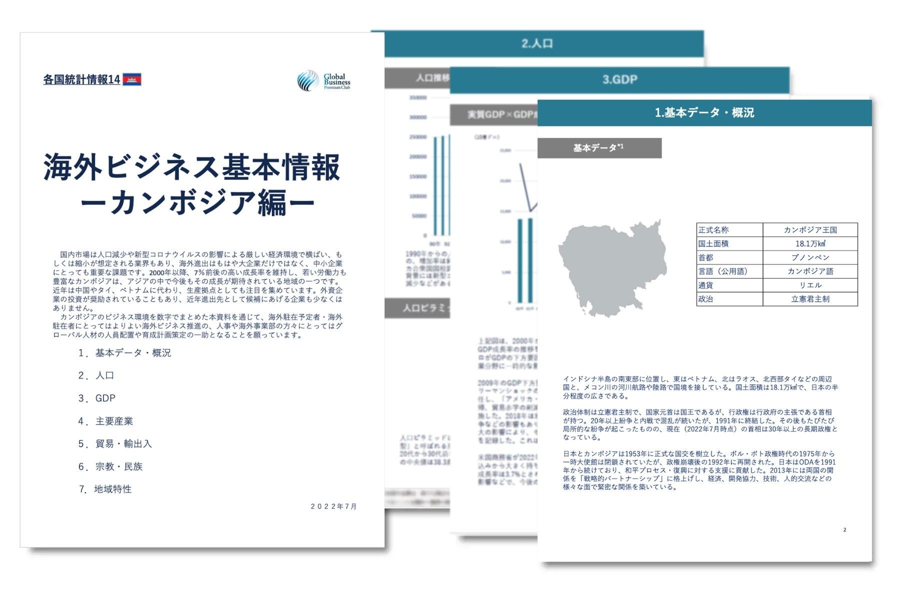 カンボジアへの海外進出を検討中の企業へ、市場調査の第一歩に必要となるビジネス環境(人口、GDP、主要産業、貿易・輸出入、宗教・民族/人種、地域特性)に関するレポートをまとめました。