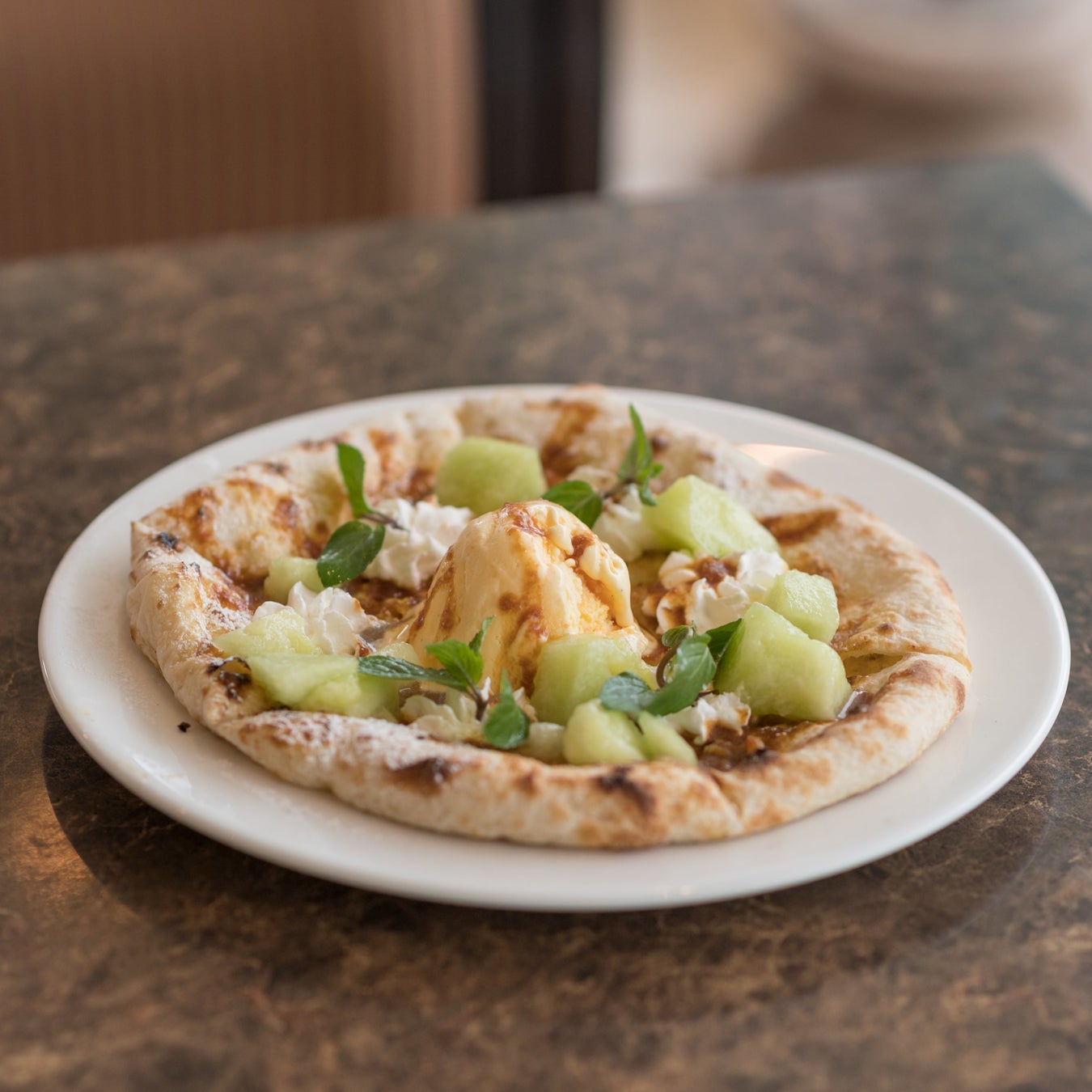 焼きたてピザの上で程よく溶けるバニラジェラートがメロンを包み込む。ほろ苦カラメルソースが口の中に広がり、その美味しさは感動もの!