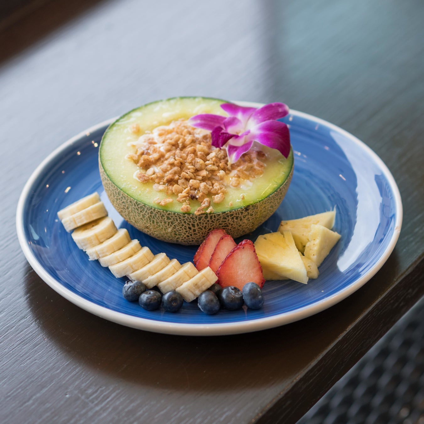 1/2カットのメロンボウルに、ヨーグルトとザクザク食感のグラノーラ、オーガニックハニーをトッピング。ジューシーなメロンを豪快にすくって召し上がれ♪