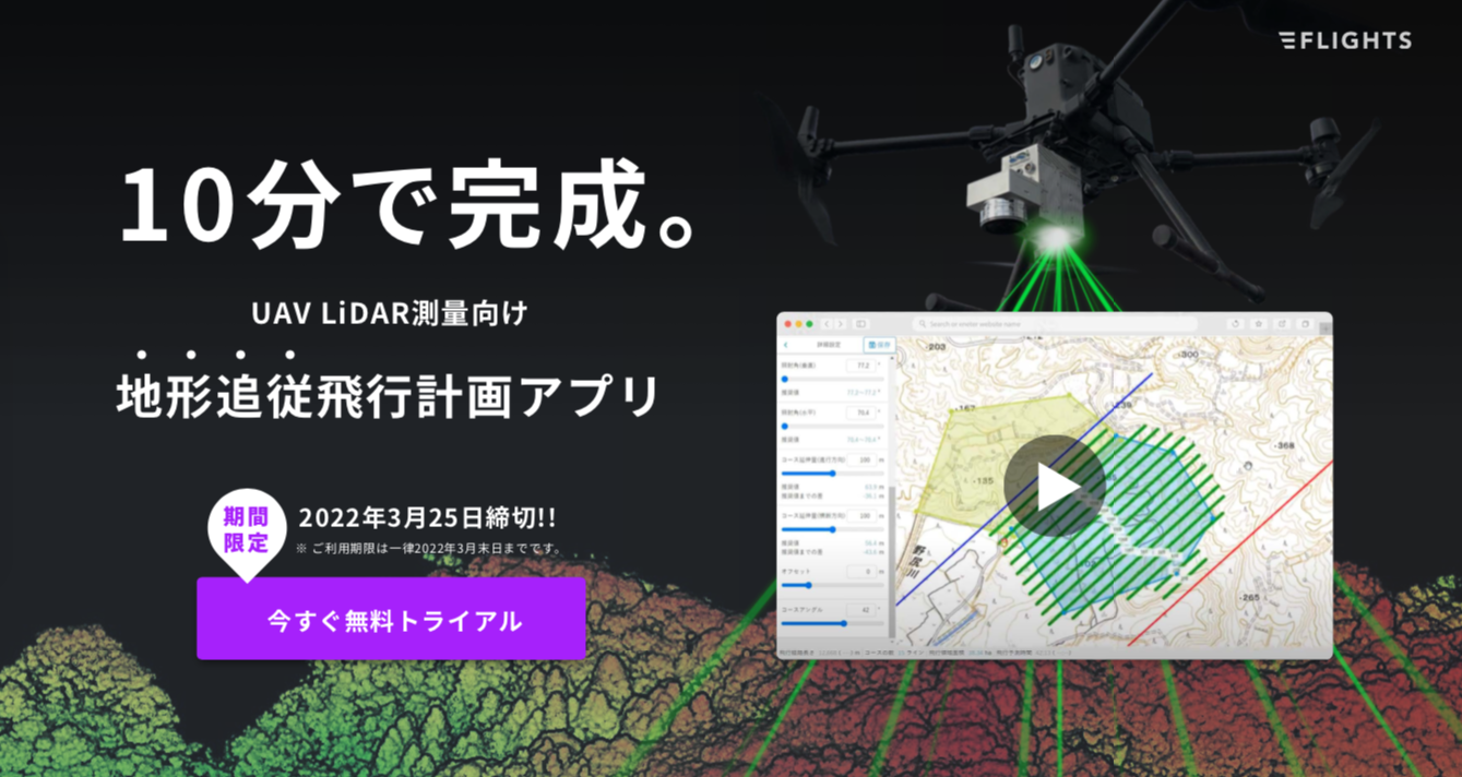 株式会社FLIGHTS(本社:東京都渋谷区、代表取締役:峠下周平 以下:FLIGHTS)は本日より、LiDAR搭載ドローンでの測量向け「地形追従飛行計画webアプリ」の無料トライアルユーザーの募集を開始しました。
