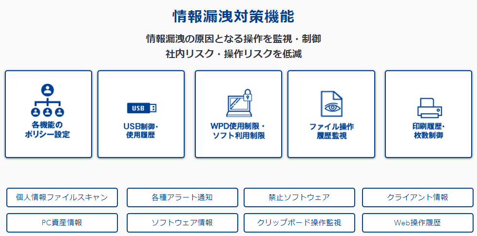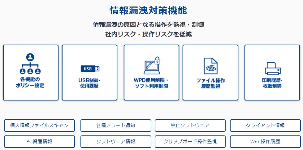 当社は、サイバーセキュリティソリューションとして、情報通信技術(ICT)を悪用した外部からの不正プログラム(マルウェア)攻撃に対する防御の提供と、企業の内部関係者によるデータベースへの不正アクセス、情報漏えい等を防止する対策に加え、業務状況の可視化による業務効率改善および働き方分析の支援を行っています。当社は、セキュアなプラットフォームで生産性とクオリティオブライフ向上を支援し、これからの第4次産業革命に向けた成長の加速を実現します。