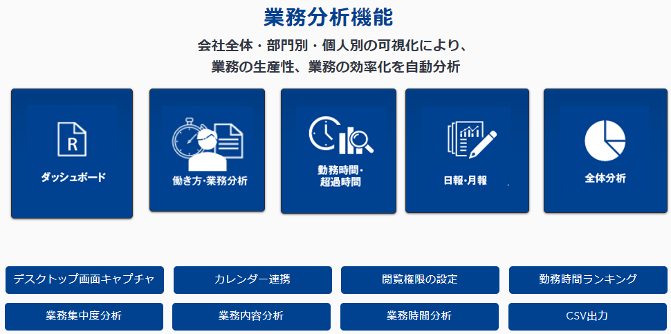 - 現代の多様化したあらゆる企業ニーズやスタイルにも対応し、業務効率の改善/生産性の向上/働き方改革の推進の最大化支援や従業員の隠れた声の見える化、異なるワークスタイル環境で働く従業員を正しく評価することにも活用できます。