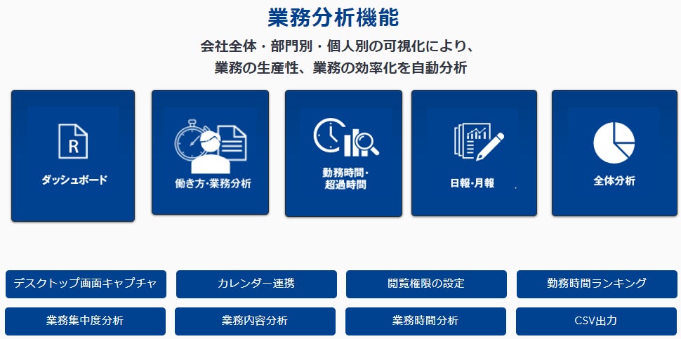 - 当社が提供するEye“247” Work Smart Cloudは、PCのさまざまな操作ログデータを活用して、日々の業務状況を分析し、従業員の働き方を見える化することが可能です。