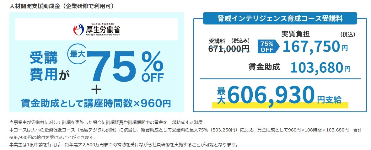 さらに、企業向けには「人材開発支援助成金」を活用することで、組織内のサイバーセキュリティ人材の育成にかかる費用を抑えつつ、次世代の脅威に対抗できる強力なセキュリティ体制の構築を支援いたします。