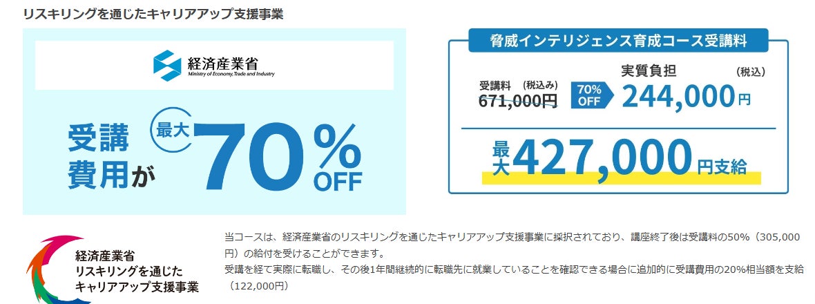 また、経済産業省による「リスキリングを通じたキャリアアップ支援事業」に認定されており、受講料が最大70%OFFとなる特典もございます。在職者の方が対象となり、スキルアップを目指すことで、キャリアの転換や年収向上を目指すことが可能です。