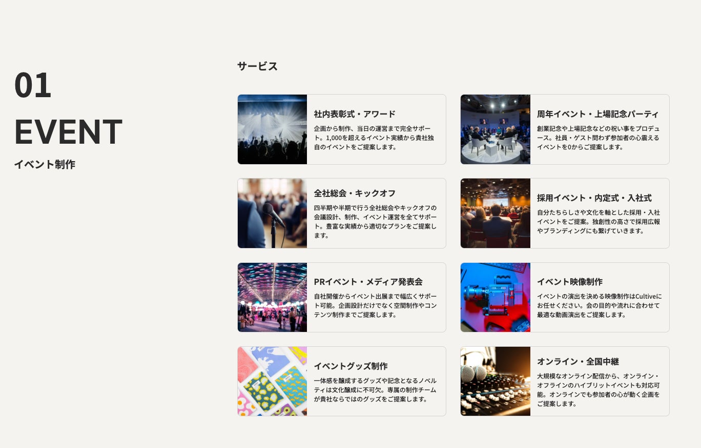 Cultive(カルティブ)は、イベントプロデュースを中心に、様々なカルチャー醸成支援を行っており、提供するサービスは多岐に渡ります。具体的には、以下の通りです。