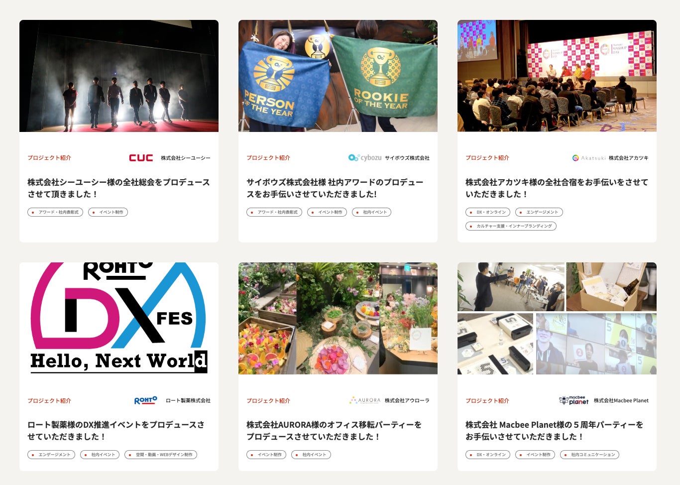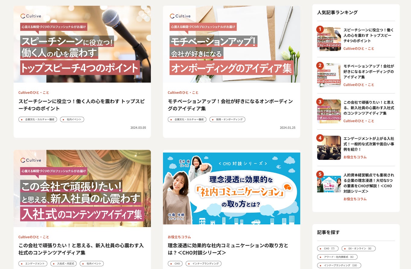 具体的な事例のページにアクセスしやすくするための工夫や、ブログでも、社内イベントを成功させる上で知っておきたいノウハウなどを多数公開しています。