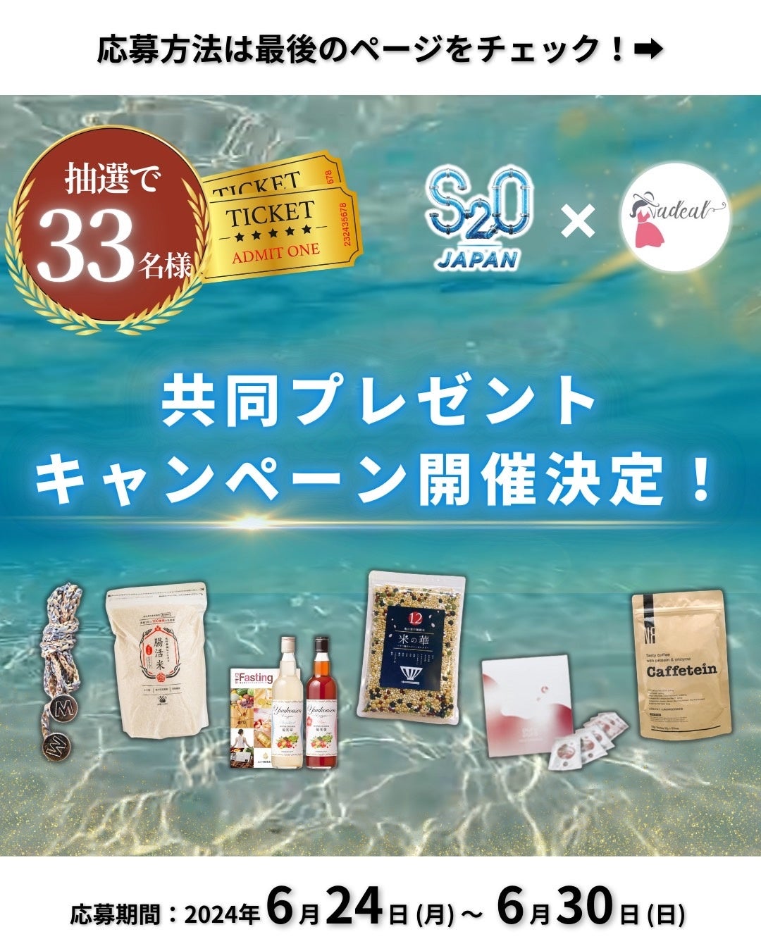 身体の中から美しくなれるダイエットアイテムや、「S2O JAPAN 2024」VIPペアチケットが3組様に抽選で当たります。