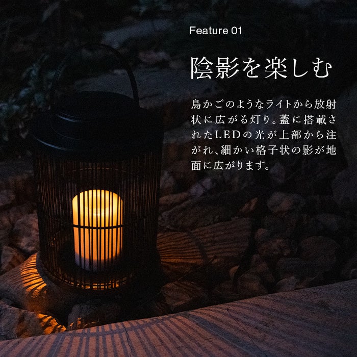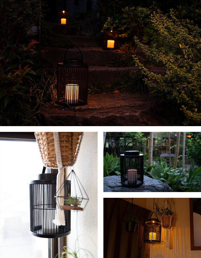 Lattice(ラティス)は陰影が特徴的なソーラー充電式のインテリアライトです。蓋に搭載されたLEDの光が上部から注がれ、細かい格子状の影が地面に広がります。キャンドルのようにゆれる灯りが、ゆったりとした時間を演出します。