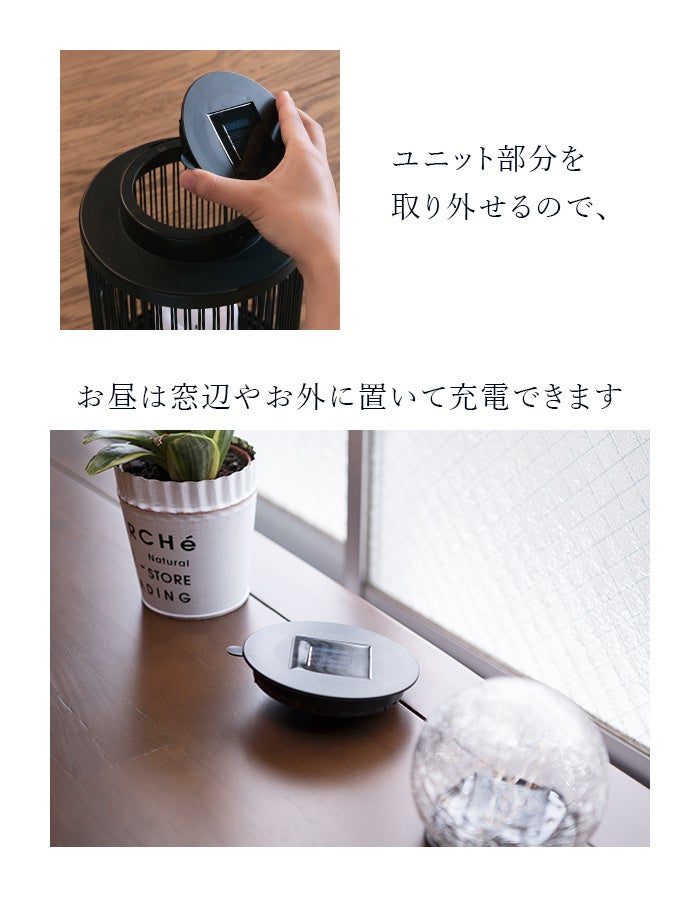LEDユニットを取り外し可能。日陰の多い場所に設置しても、ユニットだけ移動して日の当たる場所で充電することができます。