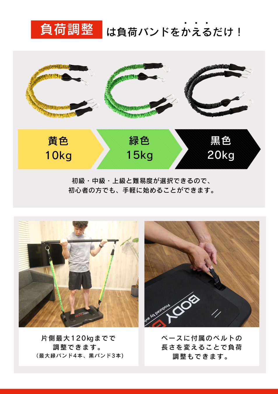 「BODYBASE」は、年齢や性別、時間、体力に制限なく運動初心者から上級者まで幅広い用途で活用できるホームフィットネスツールです。コンパクトでありながらジムで使われている大型マシンと同等の機能を備えており、バンドの長さや強度調整も自分の好みに合わせることができます。またベースの厚みや大きさにもこだわり、ワークアウトだけではなくフィジカルトレーニングやストレッチにも活用ができます。