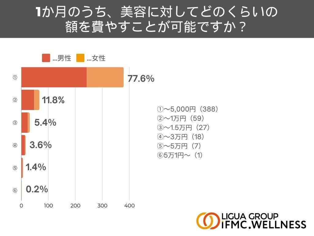 美容にかける時間は週に1時間未満という結果が67%を占め、かけられる費用は月に5,000円未満が78%でした。