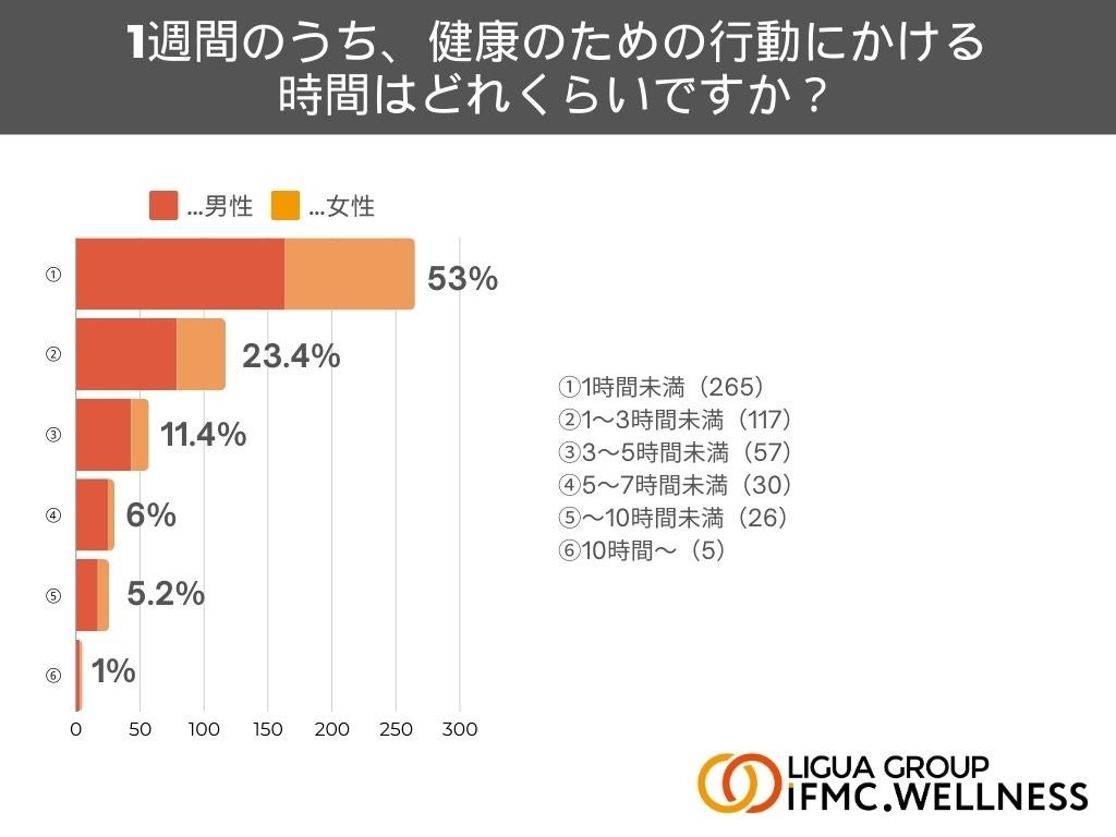 健康のための行動にかける時間は週に1時間未満が53%、費用は月に5,000円未満が76%を占めました。