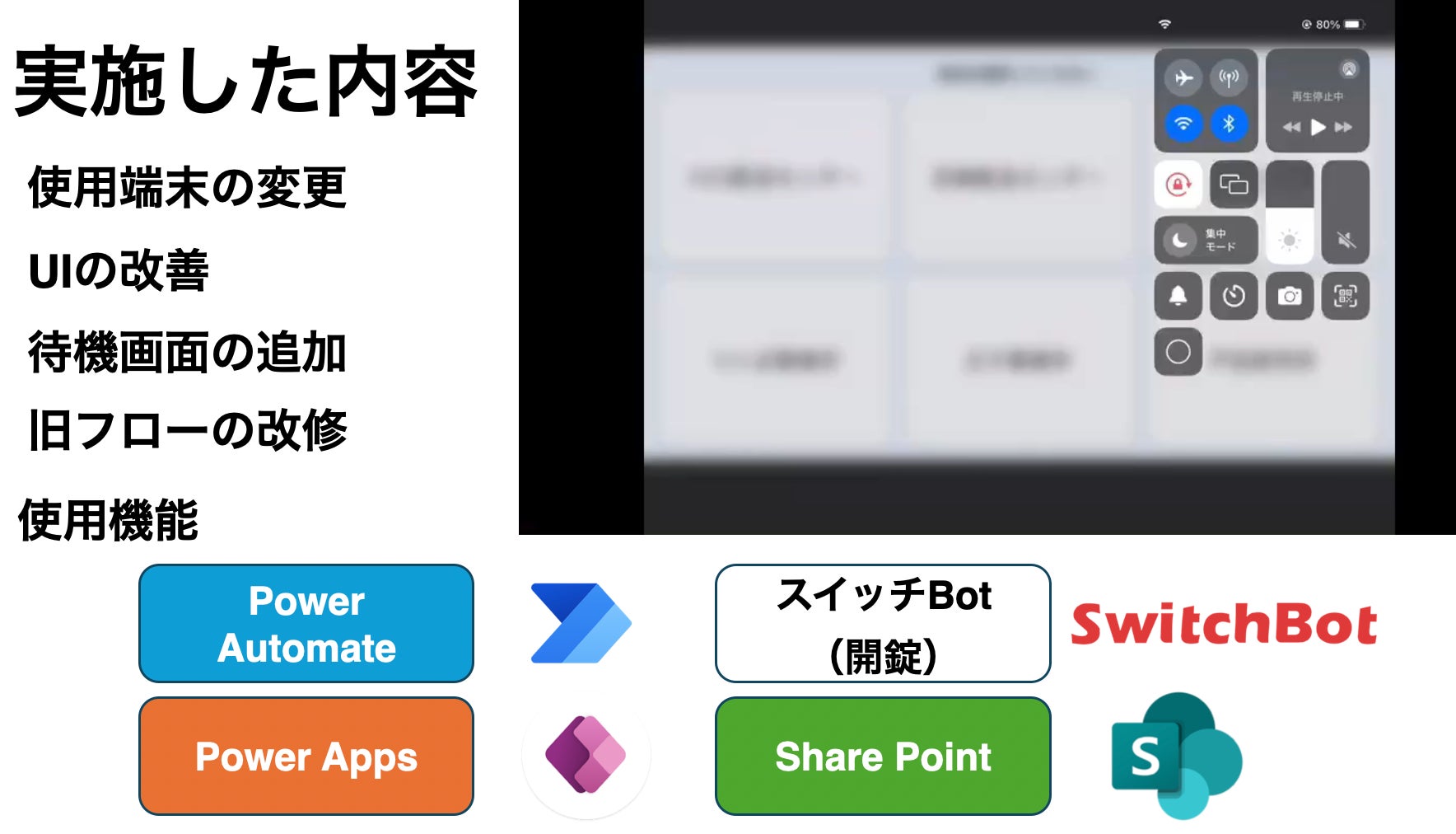 実際の事務所で利用されているPower Appsでの受付アプリを改修。UIの改修だけでなく新規機能としてQRコードによる来客管理機能、SwitchBot連携で開錠機能も実装。