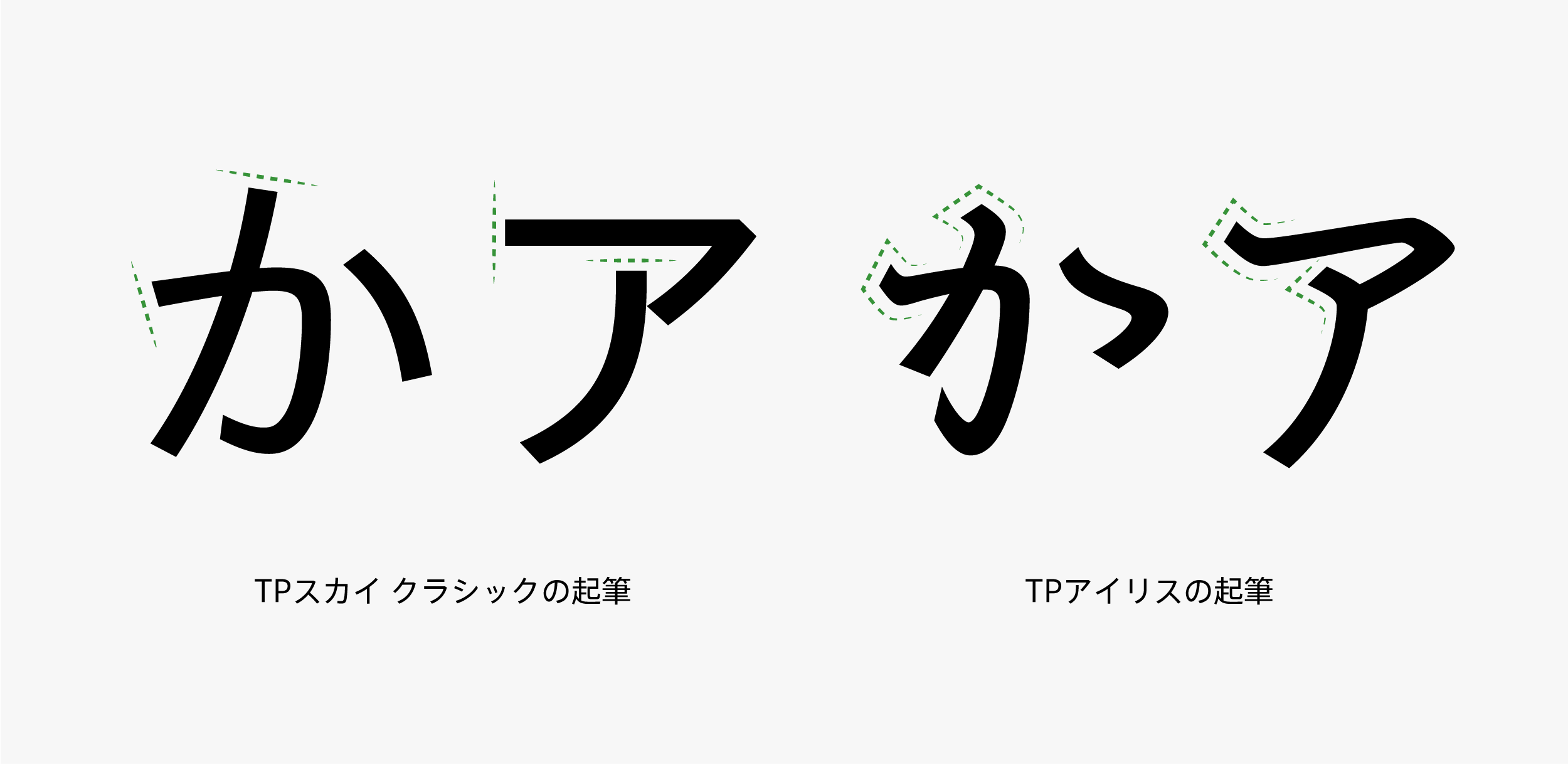 TPアイリスのユニークな点は、仮名の起筆に特徴的に表れています。通常の和文サンセリフは、起筆の形状を切り落としますが、TPアイリスは、和様の筆づかいを示す重要な要素として起筆をあつかいました。欧文ではそれぞれのコントラストの特徴に合わせて起筆・終筆の形状や角度を変えています。ローコントラストでは仮名との統一感を高め、優美な雰囲気を出すためにやや鋭角な先端にしています。また、ハイコントラストでは筆記具である平ペンの特徴を残した角度や形状を採用しました。