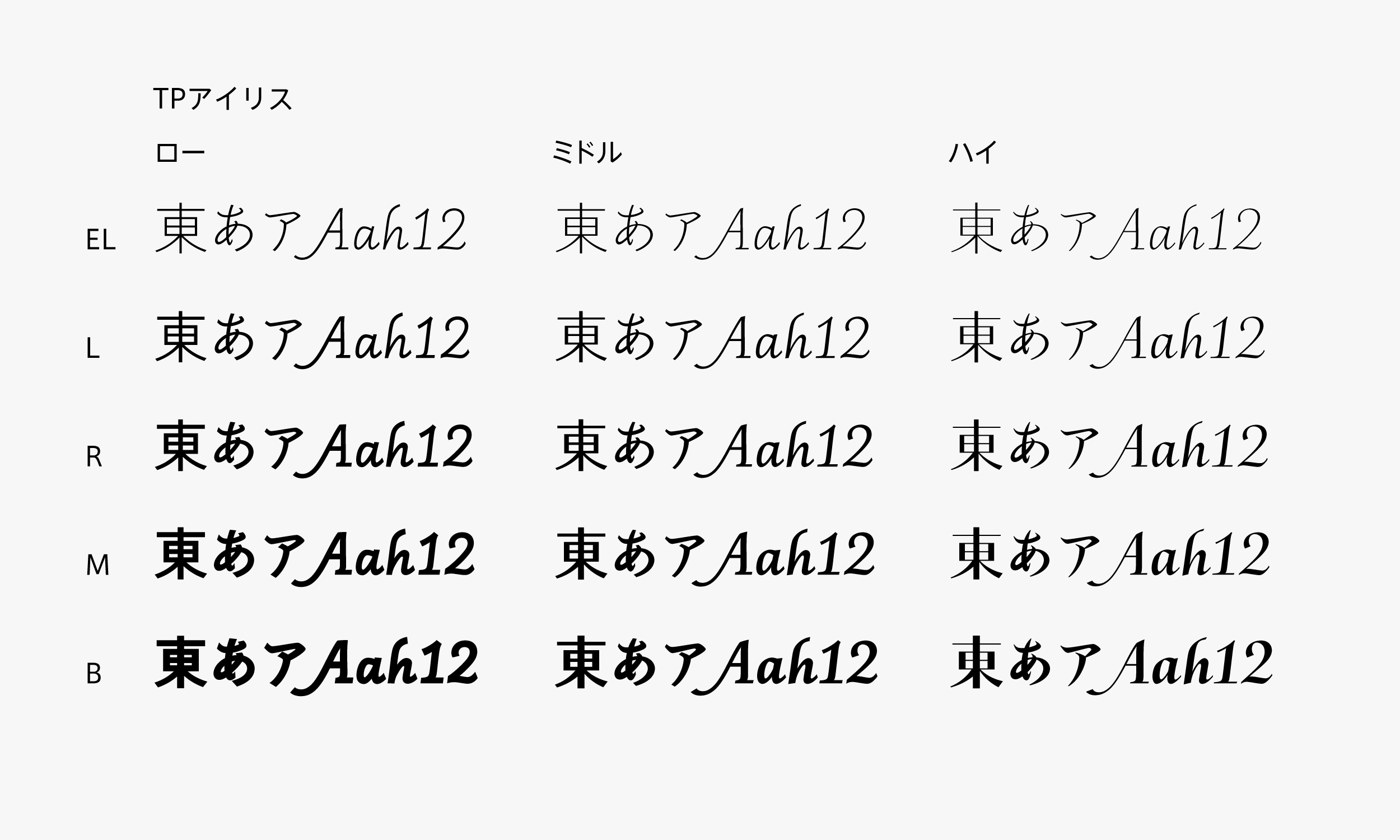 TPアイリスは、古典を核に大胆にディテールを刷新したハイコントラスト、広範な用途に安心して使えるミドルコントラスト、そして現代的な表情が新鮮なローコントラストの3つのコントラストに、それぞれ5つのウエイトで構成された、15フォントの書体ファミリーです。