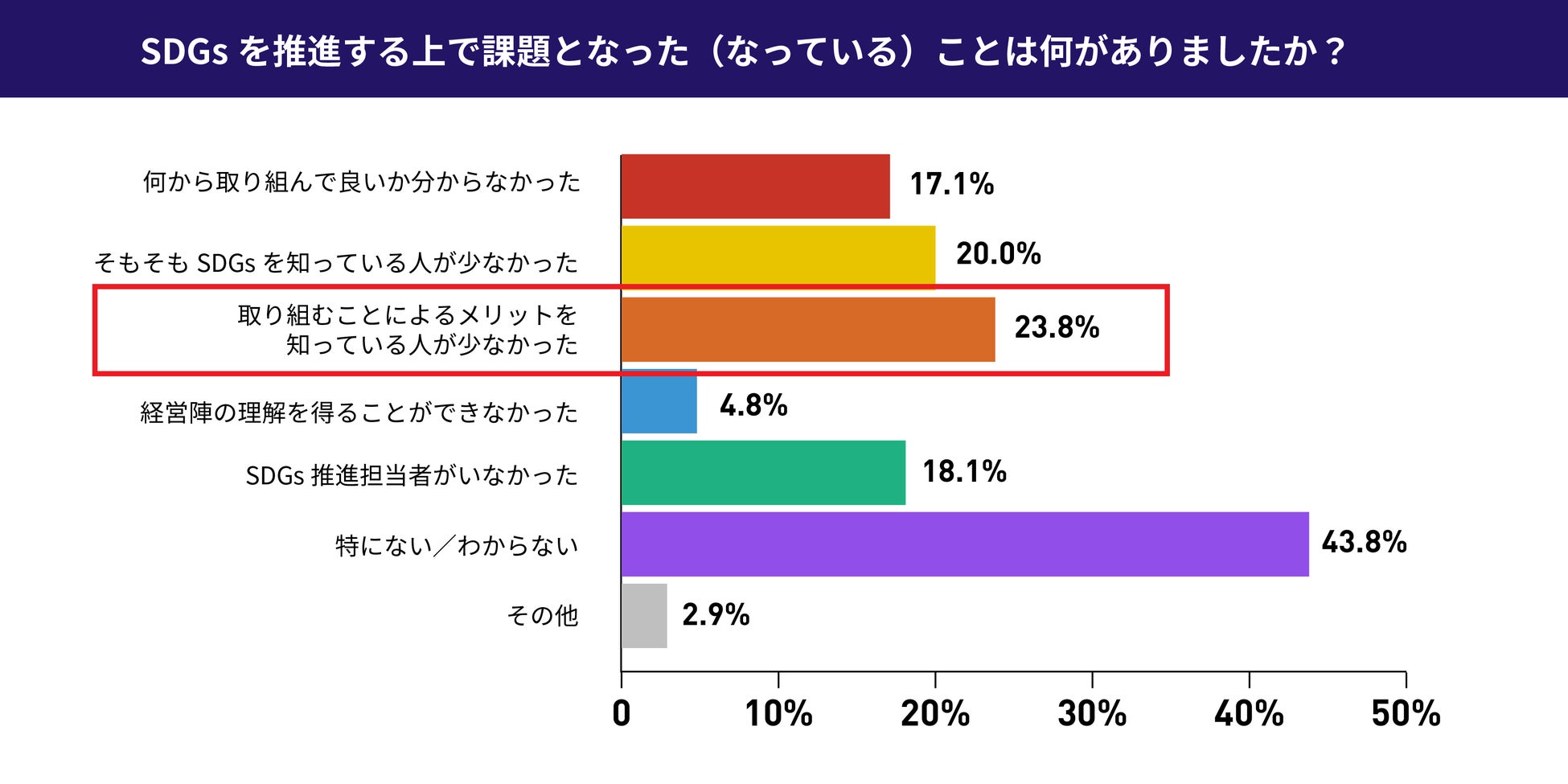 - SDGsを推進する上で課題となったことの1位は「SDGsに取り組むメリットを知っている人が少ない」