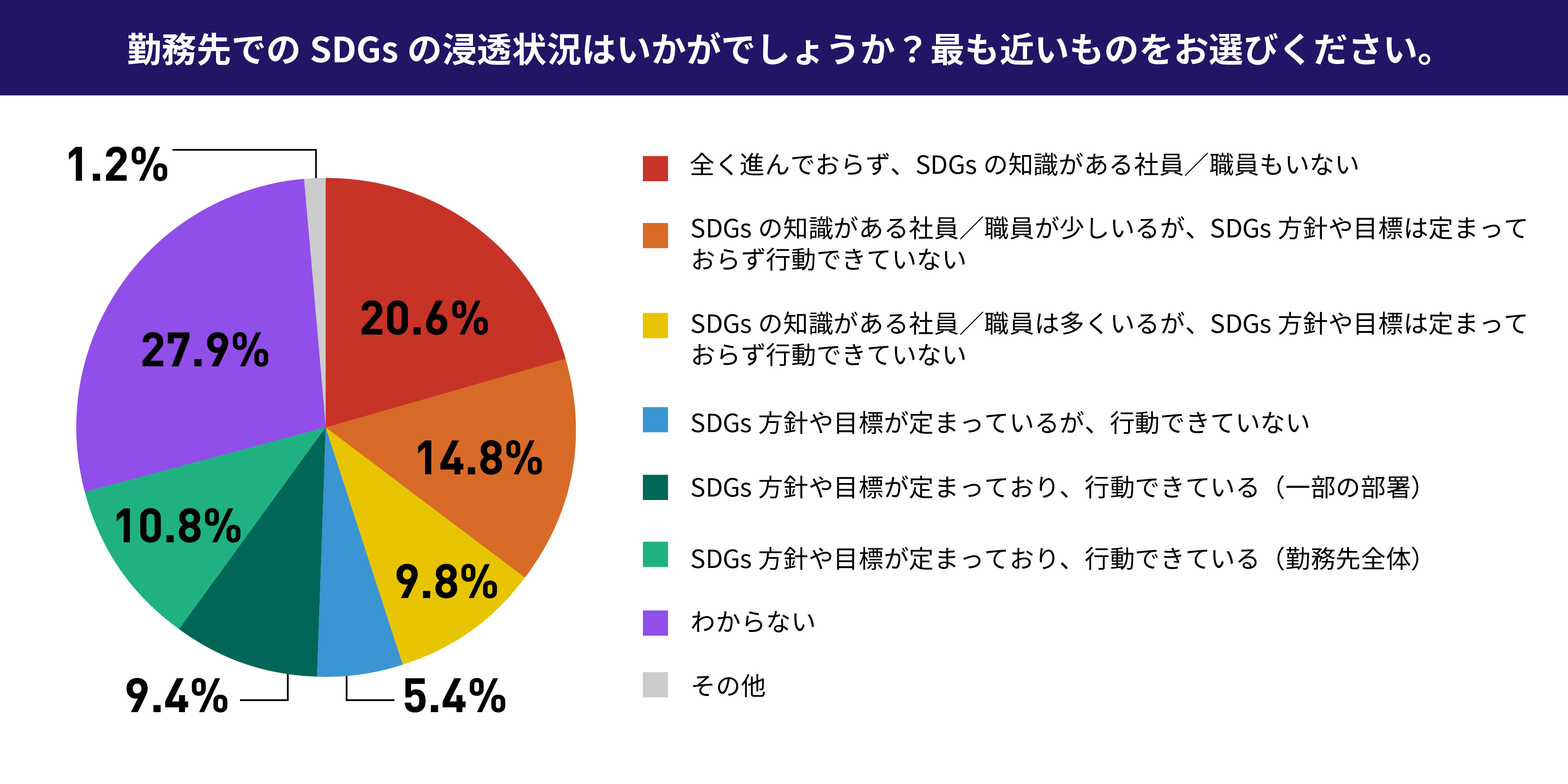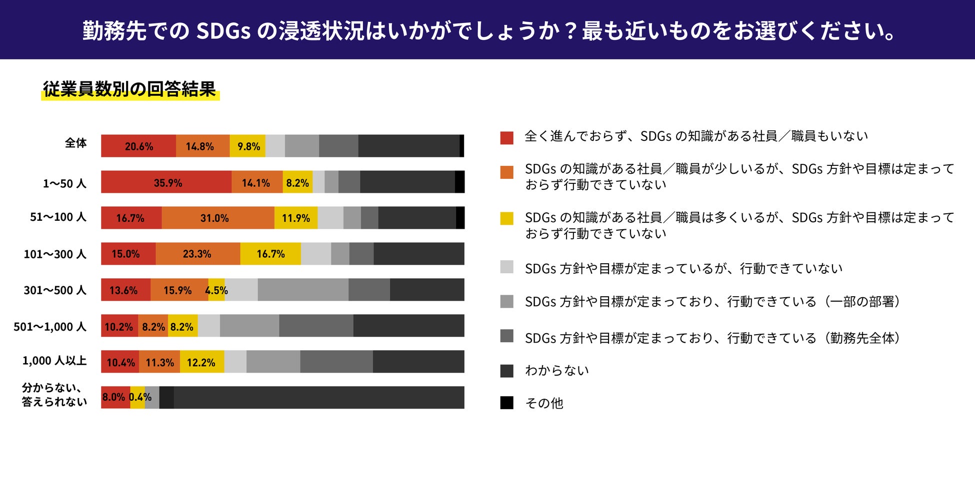 ・従業員数501名以上の企業様では、「会社全体としてSDGsの目標が定まっており、行動できている」と答えた人が20%③SDGsを推進する上で課題となったことの1位は「メリットを知っている人が少ない」