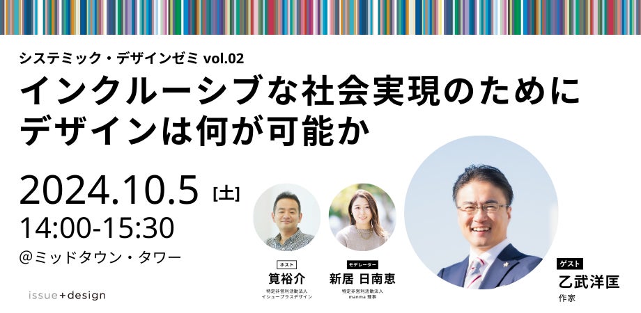 特定非営利活動法人イシュープラスデザイン(代表:筧裕介)は、2024年10月5日(土)に、作家であり日本のダイバーシティ・マイノリティ分野のオピニオンリーダーである乙武洋匡氏を特別ゲストに迎え、「システミック・デザインゼミ」シリーズを開催いたします。本イベントでは、社会課題に対するデザイン的アプローチを学び、社会システムの変革をテーマにした対話を深めていきます。