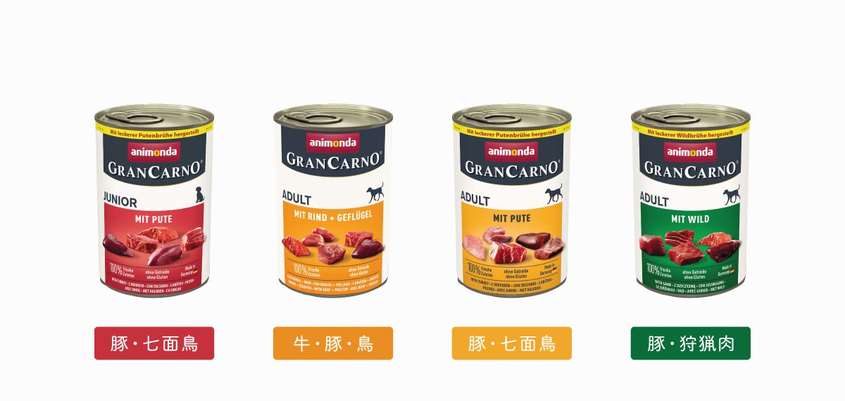 ドイツ アニモンダの定番ロングセラー「グランカルノ」シリーズに、新商品として子犬用1種、成犬用3種の計4種が登場しました。