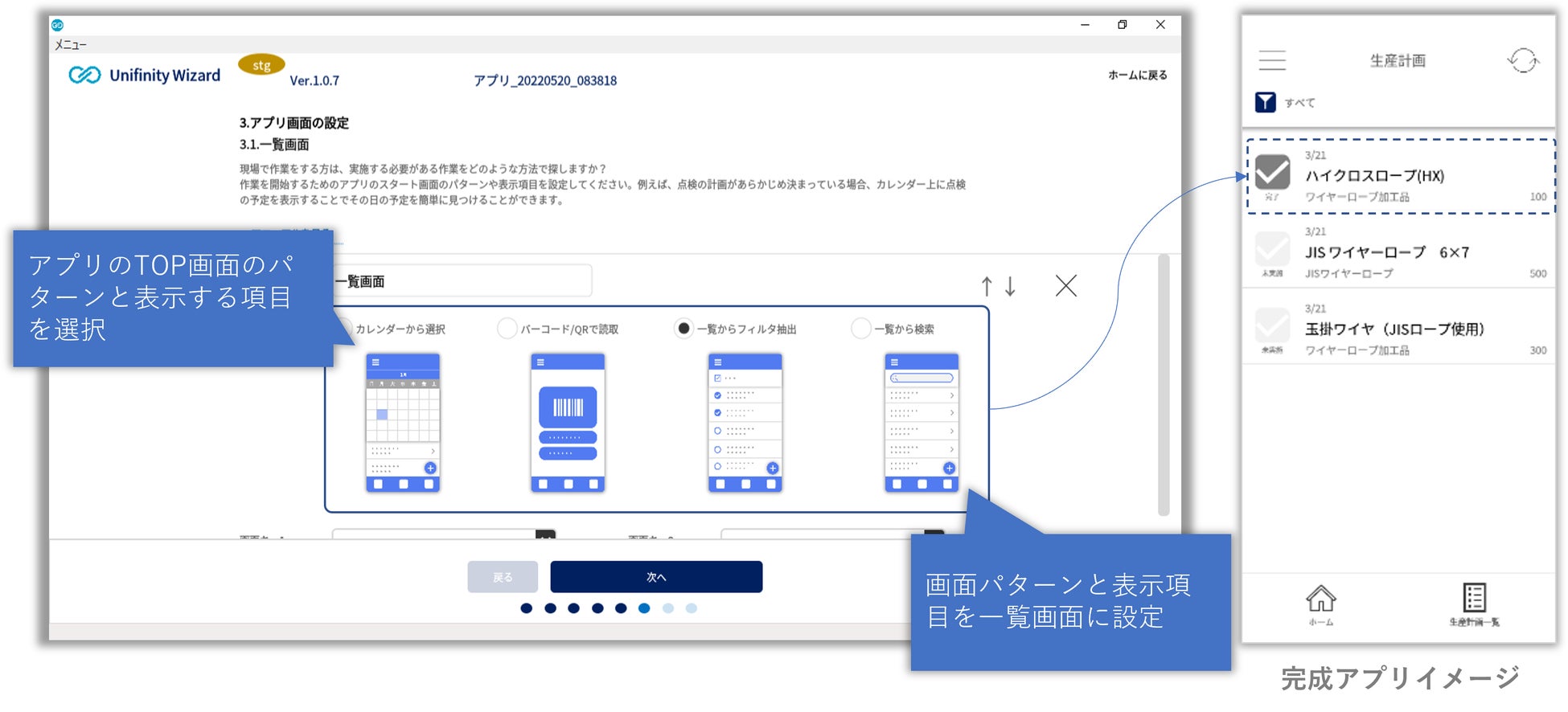Unifinity Wizardを使えば、3ステップの設定だけでUnifinityの豊富な実績に基づいた便利で使いやすいアプリを簡単に作成できます。