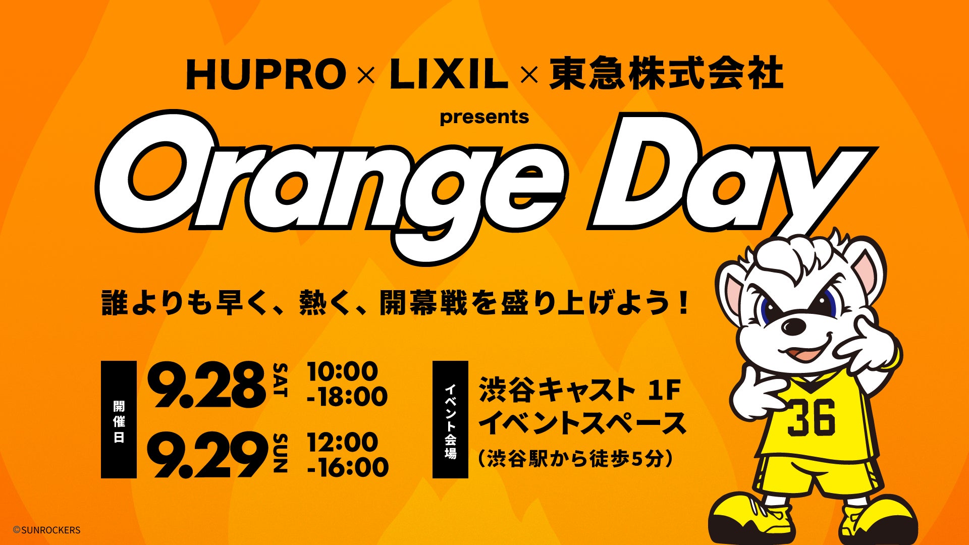 株式会社ヒュープロは、サンロッカーズ渋谷のオフィシャルトップパートナーである株式会社LIXIL様・東急株式会社様にご協力いただき、選手へのメッセージフラッグを作成するイベント『Orange Day』を9月28日(土)、29日(日)に「SHIBUYA CAST/渋谷キャスト」にて開催する運びとなりました。
