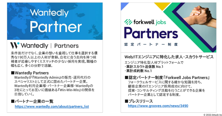 弊社はWantedlyやforkwell jobsといった主要なダイレクトリクルーティングのオフィシャル認定パートナーとなっております。またダイレクトリクルーティングメディア様との共催セミナーも多く実施させていただいており、メディア運営企業様からも一定の信頼を得ていると自負しております。