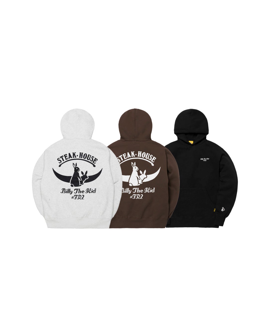 Tシャツ、フーディ、キャップは、ブラックとホワイトに加え、ステーキをイメージしたブラウンの3色で展開(キャップはブラックとブラウンの2色)。ビリー・ザ・キッドの世界観をカラーパレットでも表現しています。