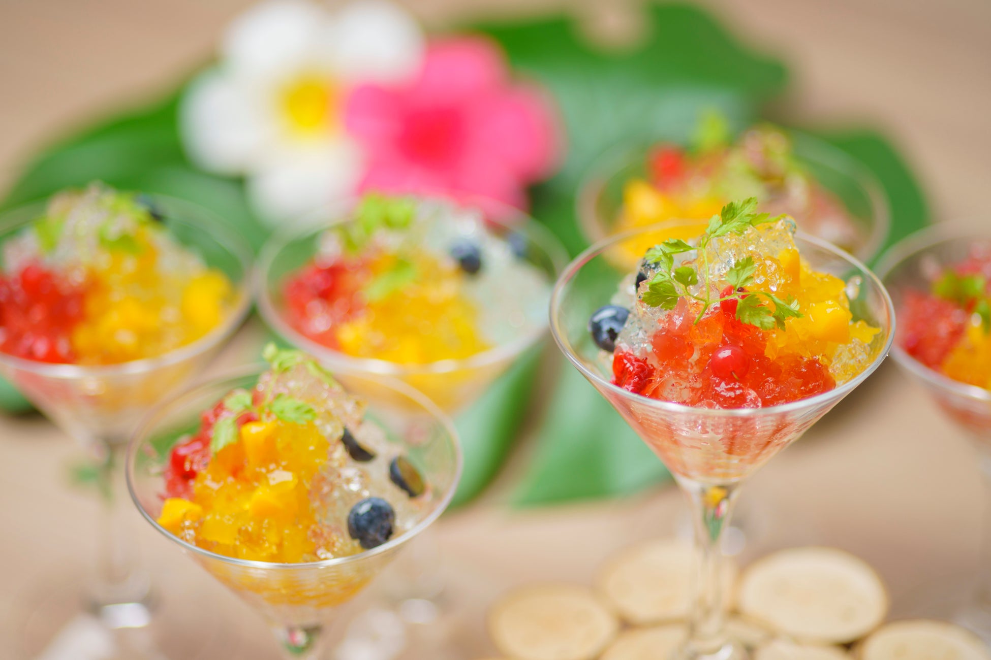 暑い夏に食べたくなるかき氷をイメージしフランボワーズ、マンゴー、ソーダのゼリーとレモン風味のクラッシュゼリーでさっぱりと夏を感じる一品です。