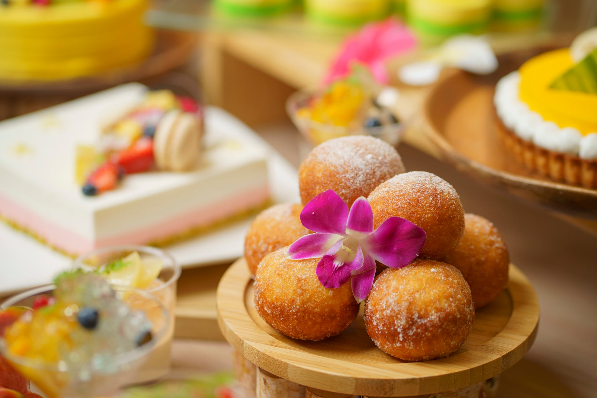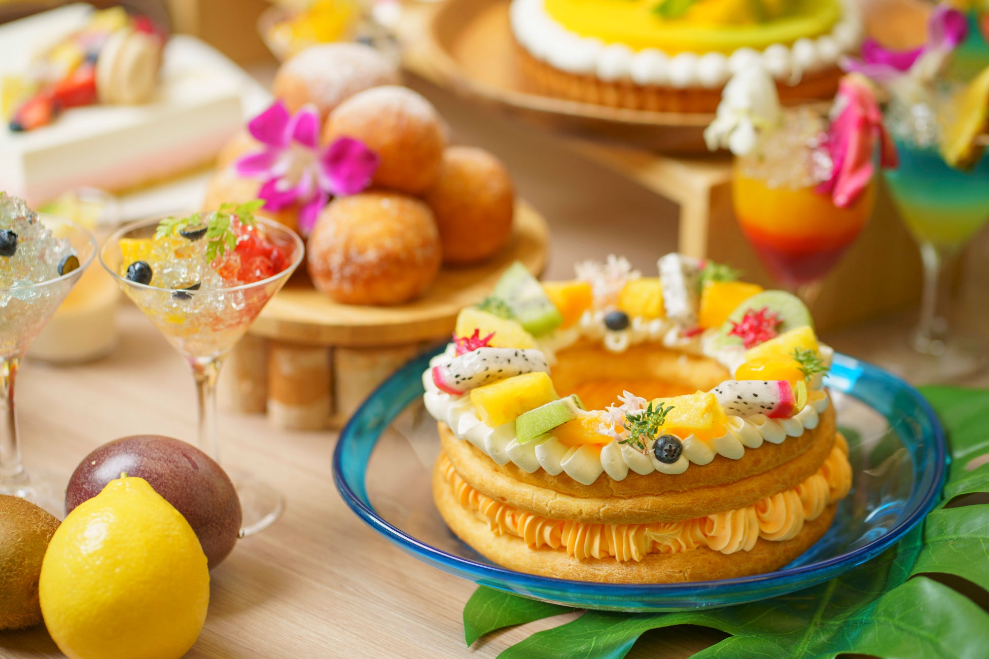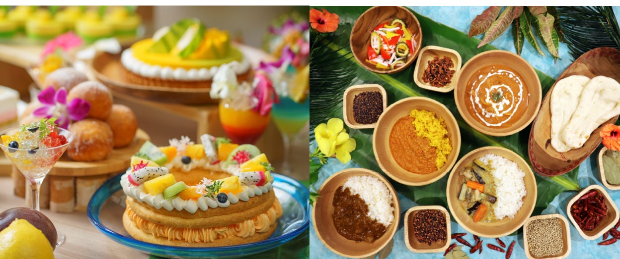 オールデイダイニング「グランドキャッスル カフェ&ダイニング」では四季に合わせスイーツビュッフェを提供し、今回は沖縄で生産されたフルーツをふんだんに使用したスイーツと4種類のカレーで「甘いと辛い」の無限ループのお時間を期間中の週末・祝日限定にてお楽しみいただけます。カレーはキーマカレー、バターチキンカレー、グリーンカレー、とろとろ牛すじのカレーの計4種類とナンをご用意いたします。この時期しか味わえないカラフルで色鮮やかな可愛らしいスイーツと、カレーの最強タッグを心ゆくまでご堪能ください。辛くないカレーもご準備いたしますので、辛いものが苦手な方やお子様も安心してお召し上がりいただけます。