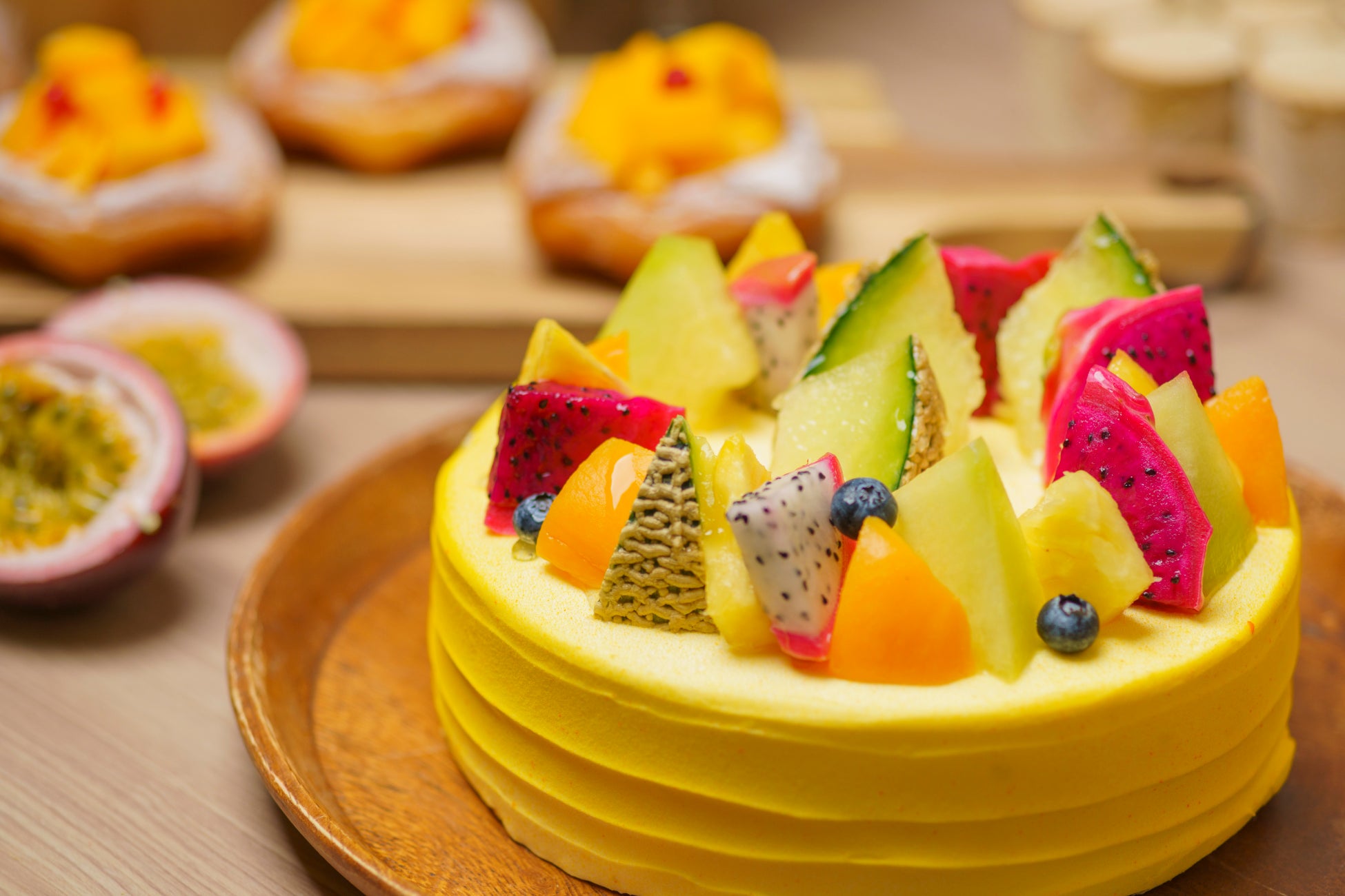 ドラゴンフルーツ、マンゴー、パイナップル、メロン、ブルーベリーで贅沢にデコレーションした旬のフルーツのホールケーキ。ビタミンチャージもご一緒に。